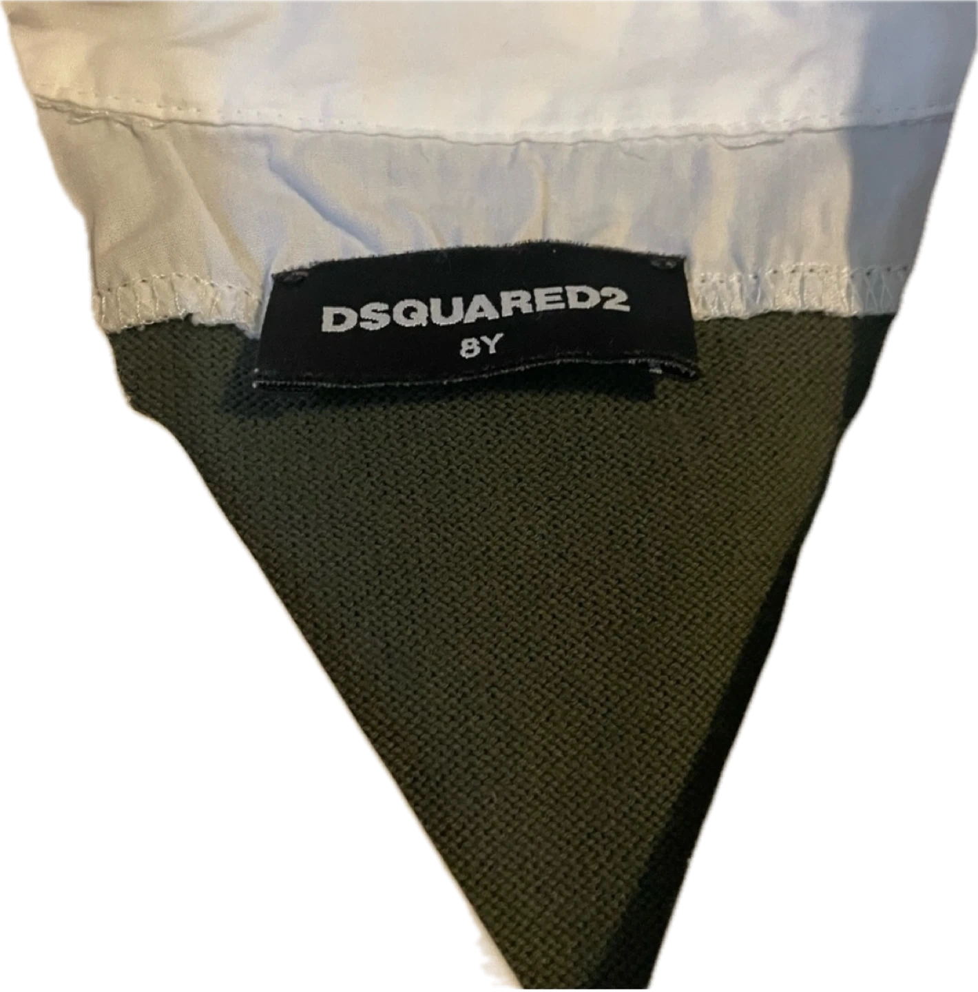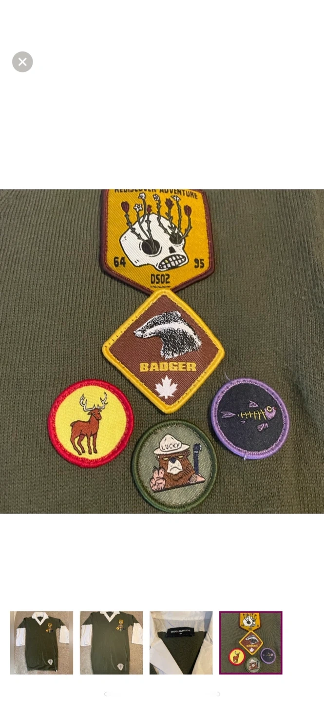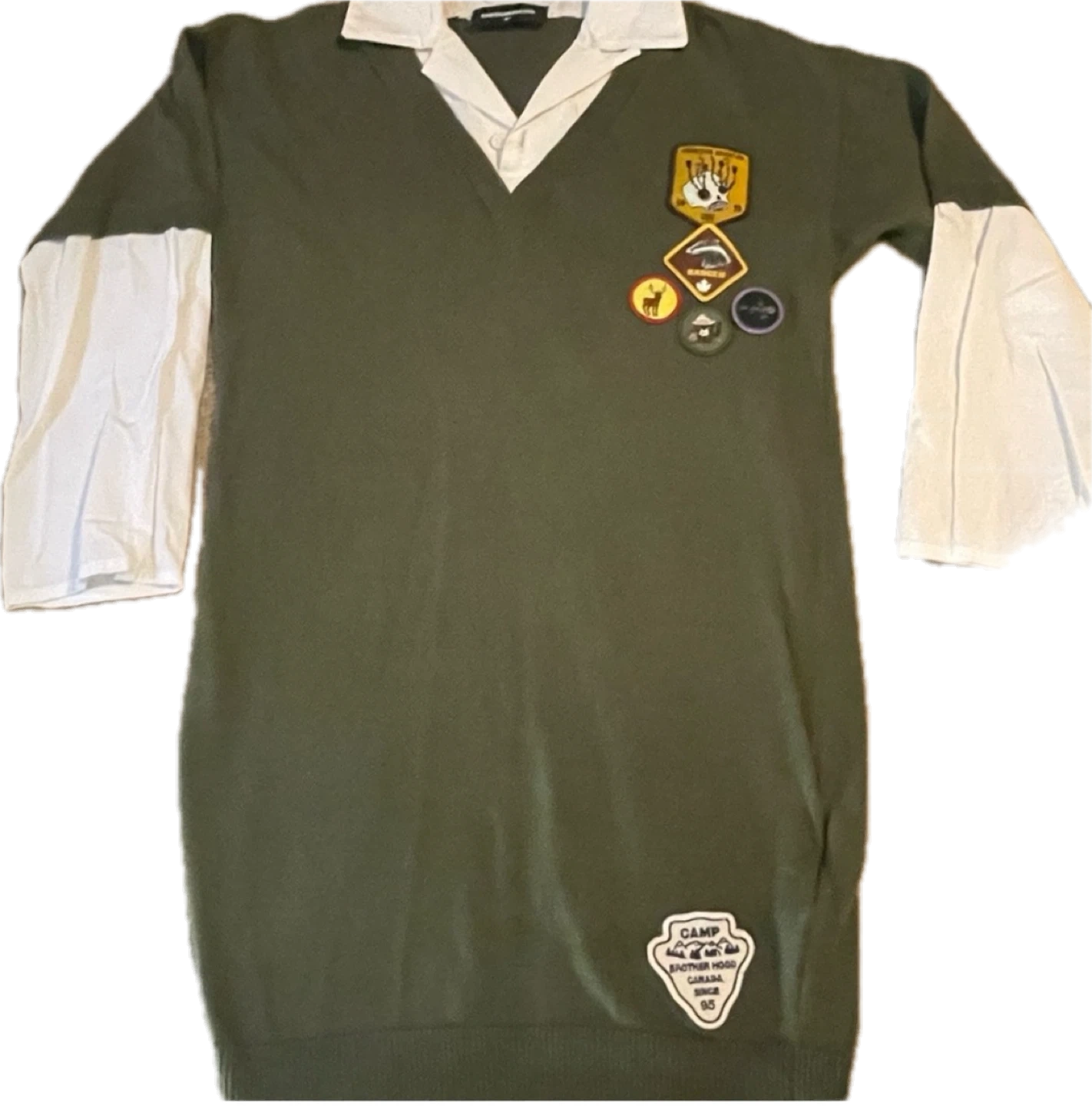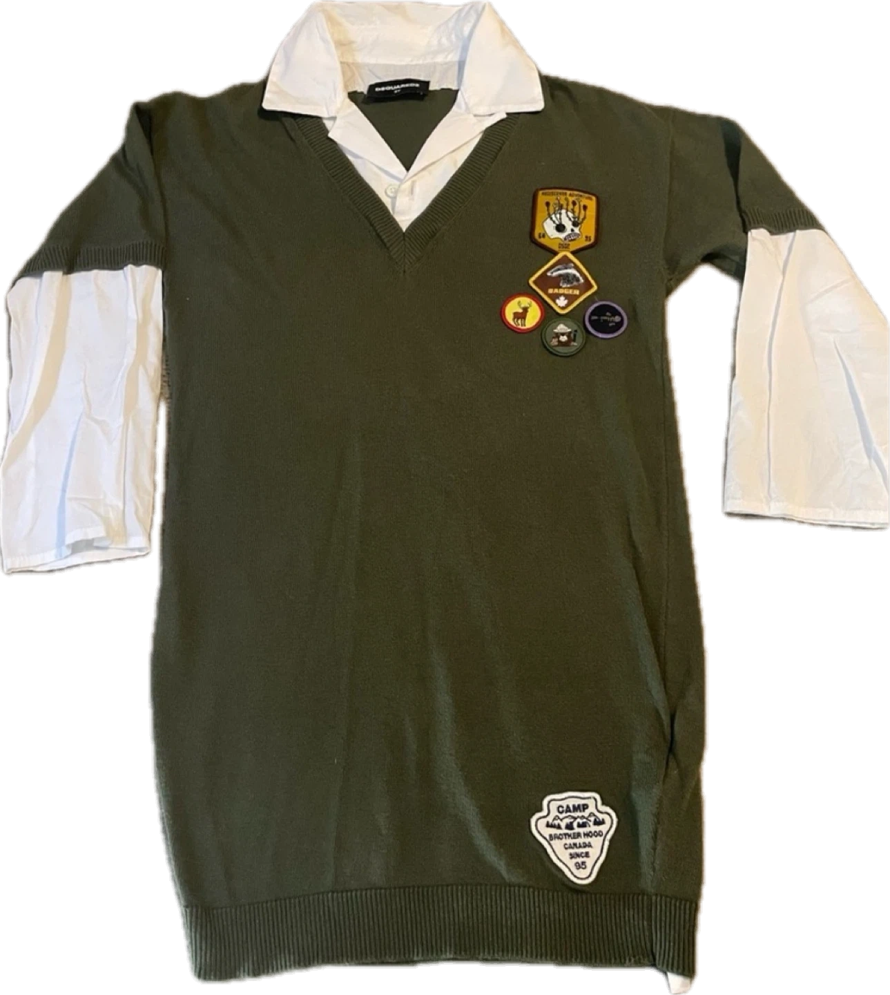 This DSQUARED2 sweater dress features a white collared shirt layered under a dark green v-neck knit. It's adorned with various camp-themed patches, including a badger and a deer. The dress also has white long sleeves. Perfect for casual outings or themed events!
