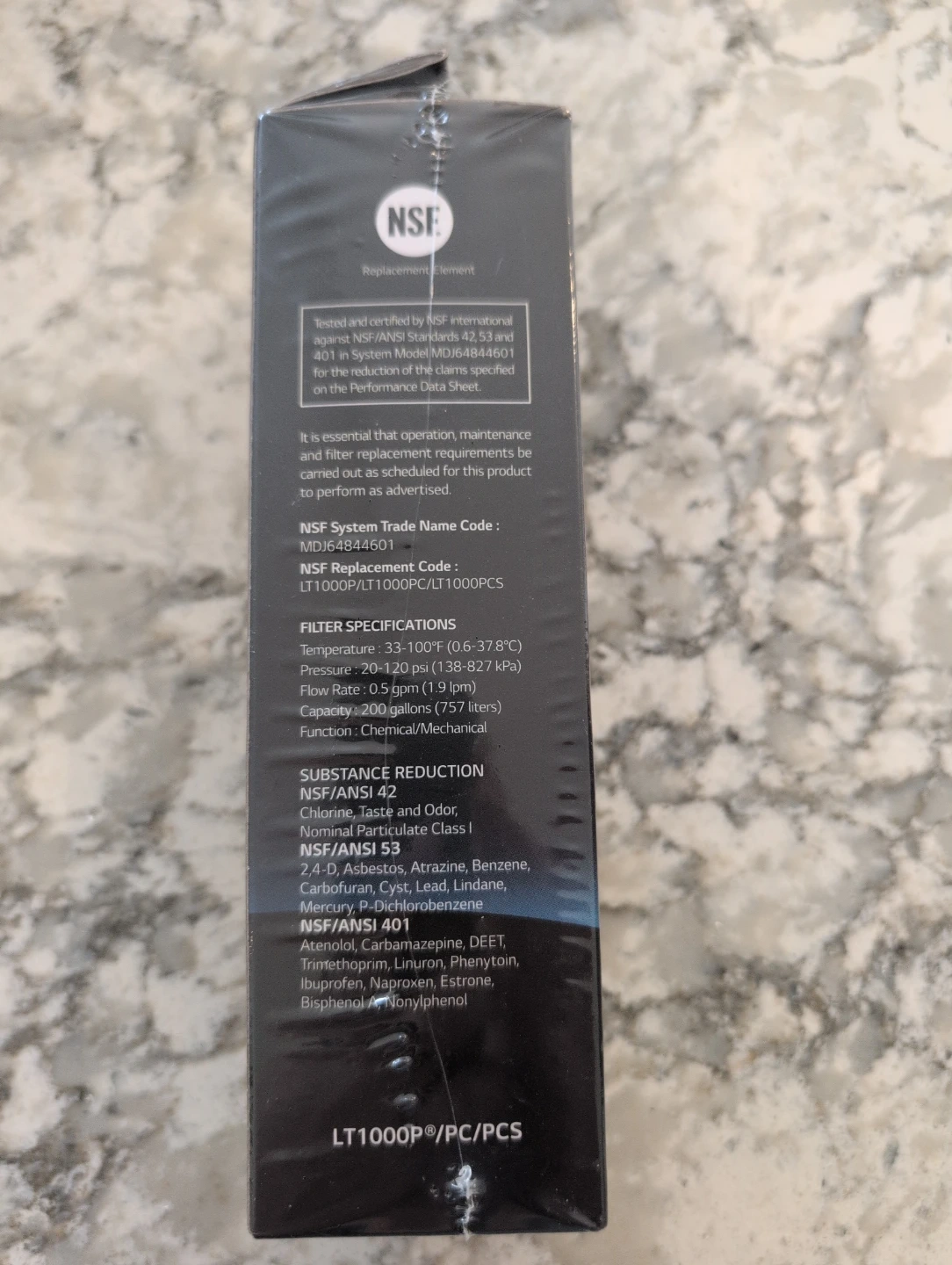 Brand new, LG LT1000PC/PCS water filter replacement cartridge. It's NSF certified for chlorine taste and odor reduction, as well as for reducing lead and mercury. The filter is designed to last for 6 months or 757 litres.