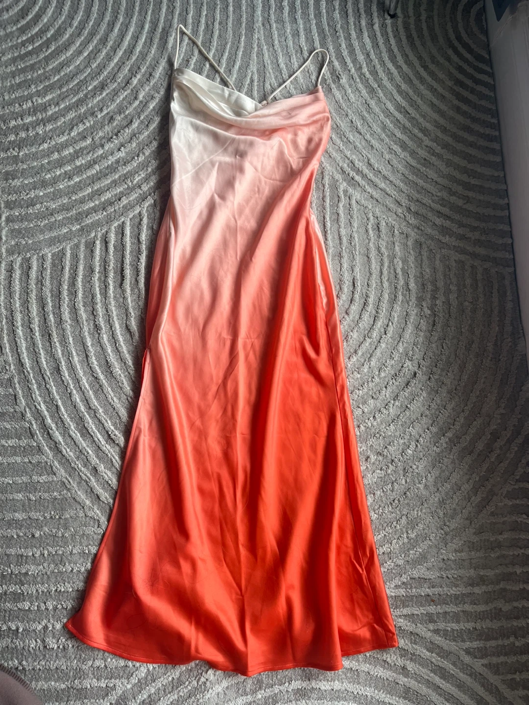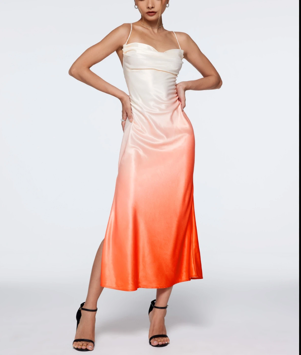 This ombre slip dress features a cowl neckline and adjustable spaghetti straps. It's made of a satiny material with a gradient of white to coral. A simple zipper closure is on the side.