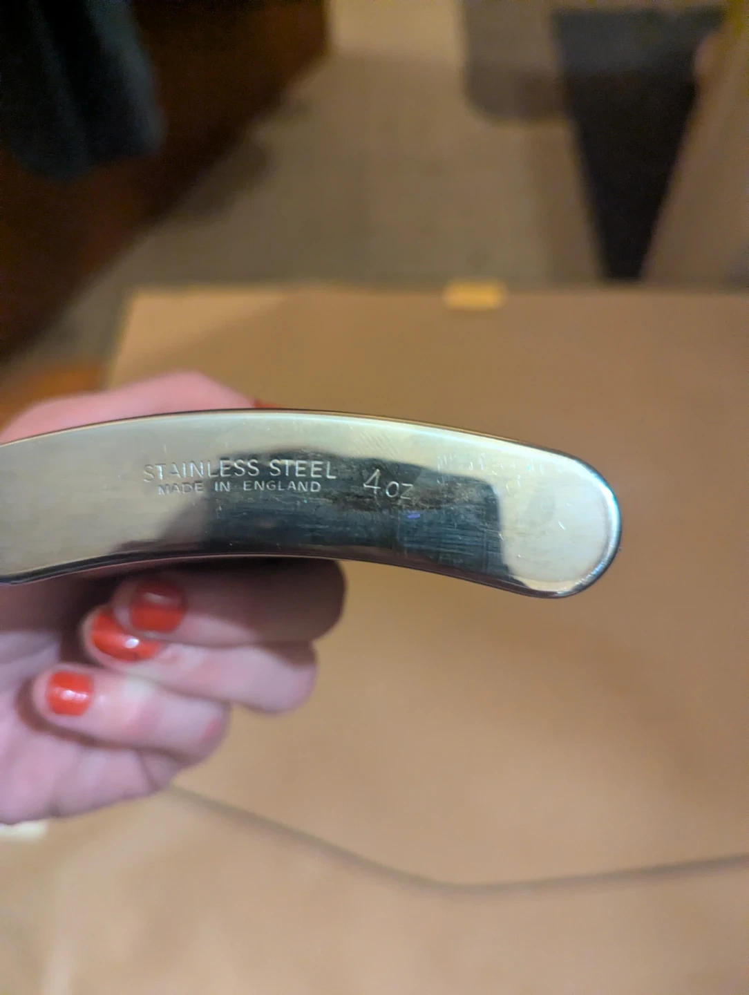 Selling a stainless steel flask, holds 4oz. It's made in England and has a real leather exterior