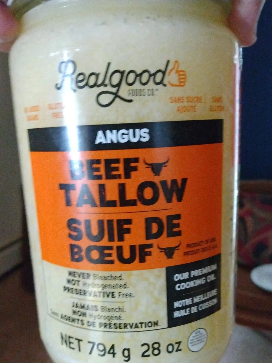 Realgood Foods Angus Beef Tallow is never bleached, not hydrogenated, and preservative-free. It's our premium cooking oil. 794g jar.