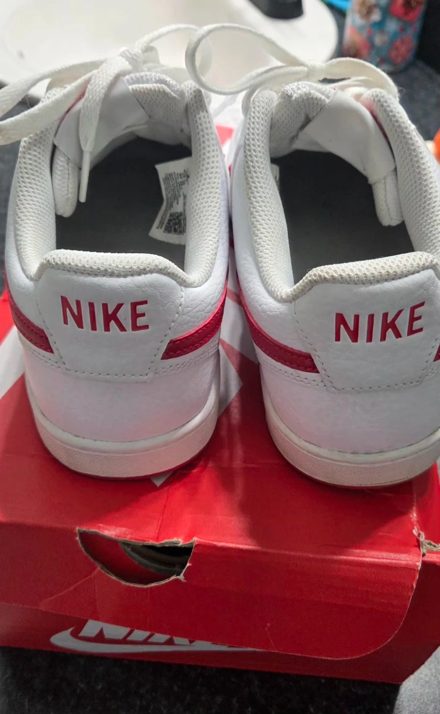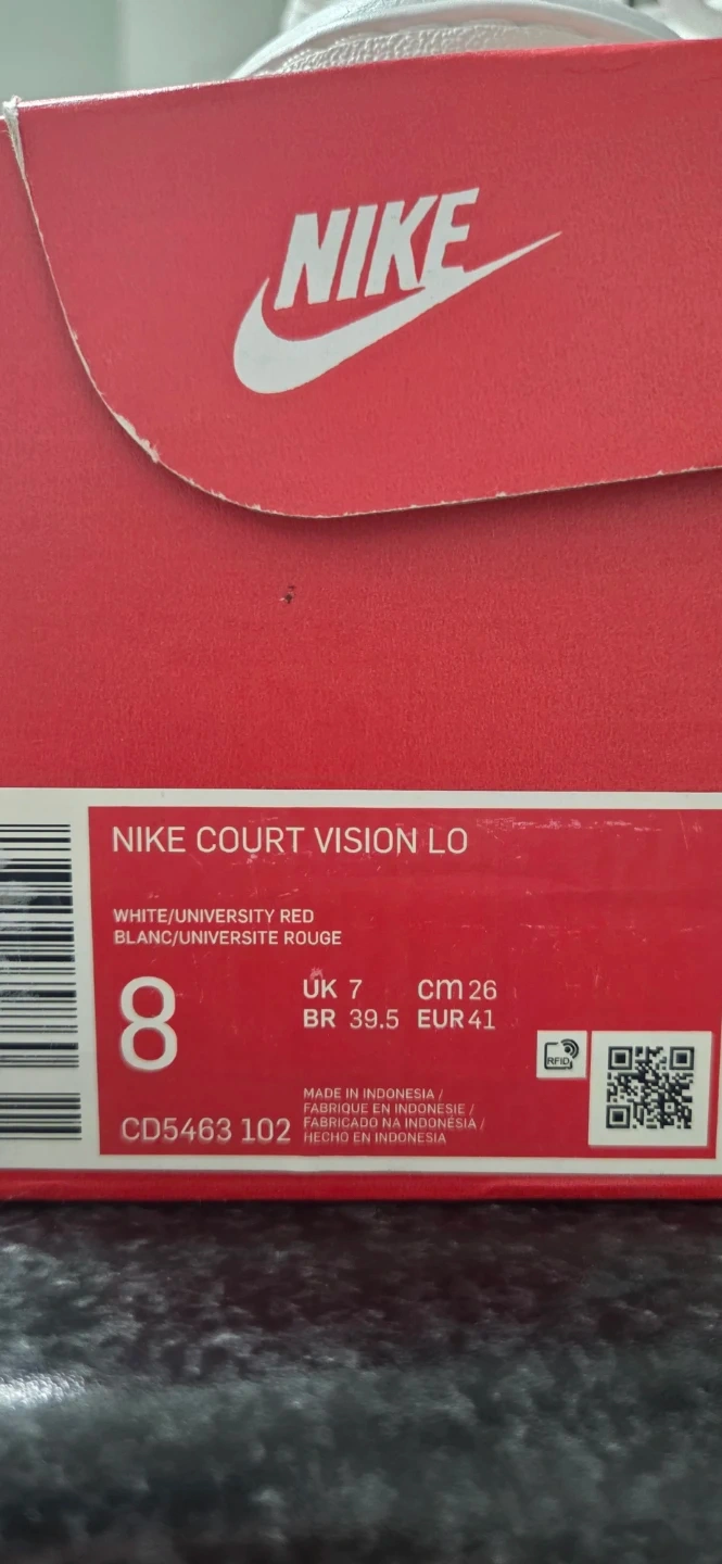 These Nike Court Vision Lo sneakers come in white with red accents. They feature a classic low-top silhouette perfect for everyday wear. Made in Indonesia.