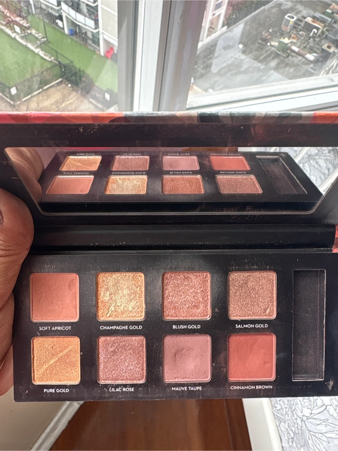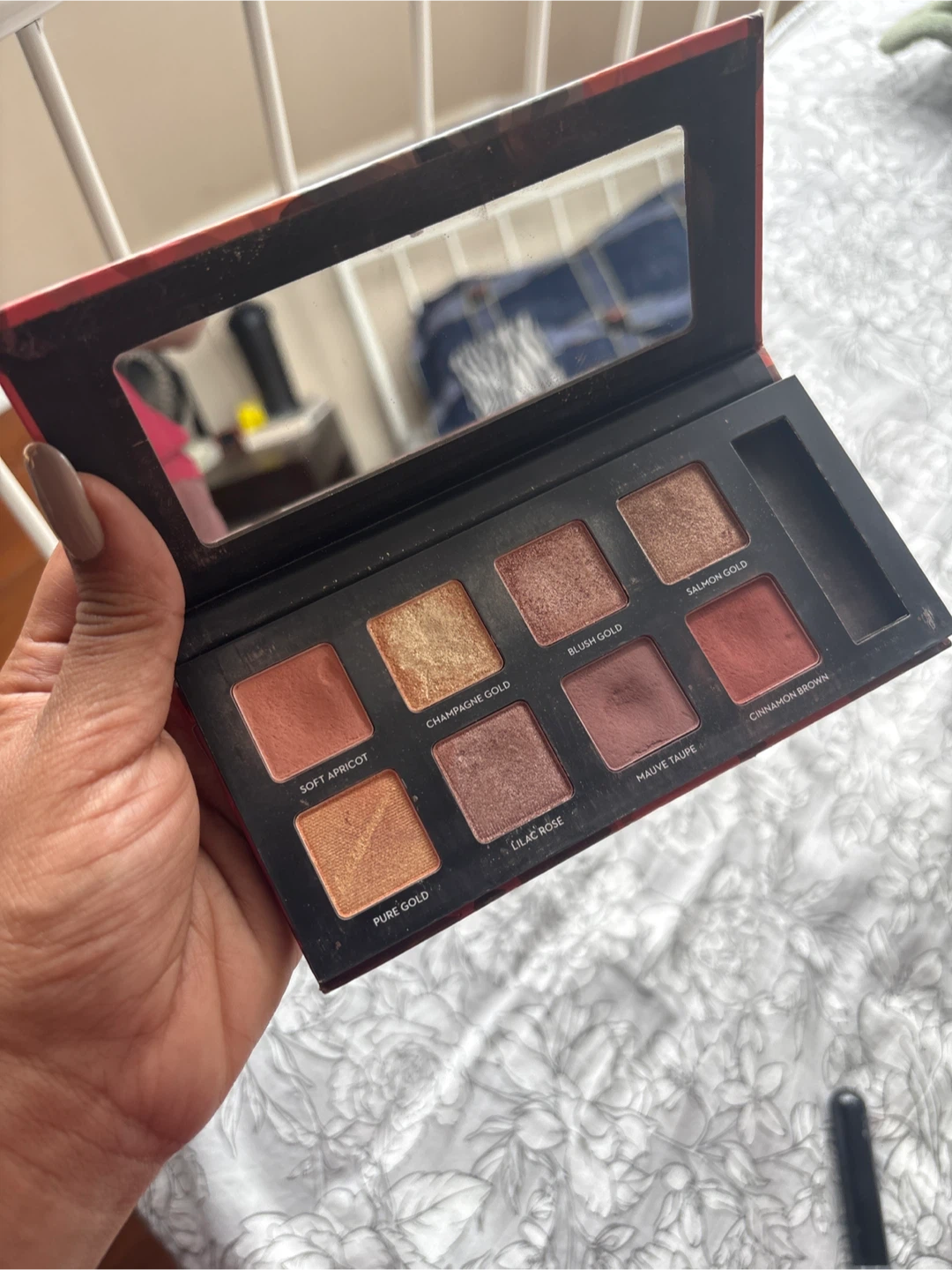 Eyeshadow palette with 8 shimmery and matte shades. Includes Soft Apricot, Champagne Gold, Blush Gold, Salmon Gold, Pure Gold, Lilac Rose, Mauve Taupe, and Cinnamon Brown.