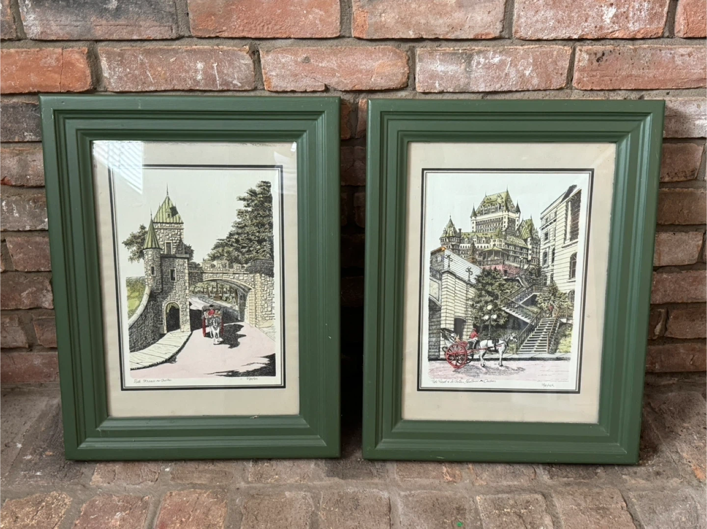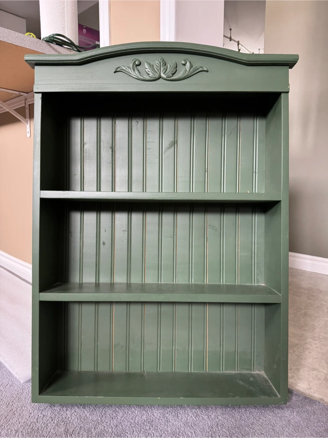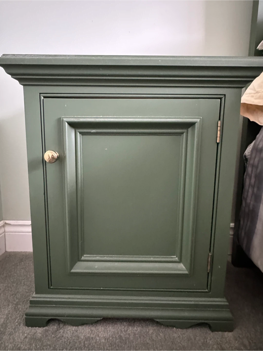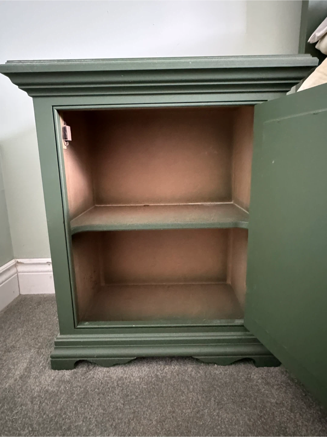 Double bed with 2 matching green nightstands and a tall dresser with gold hardware. The nightstand has one door with shelves inside, and the dresser has six drawers for storage. Both pieces have a classic, traditional design with decorative trim. Includes shelf and 2 pictures.