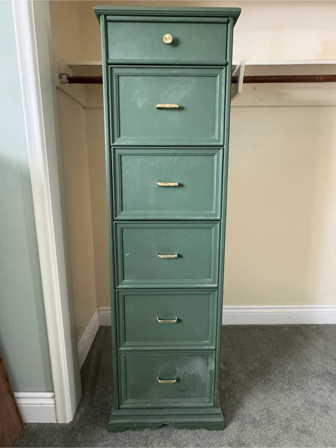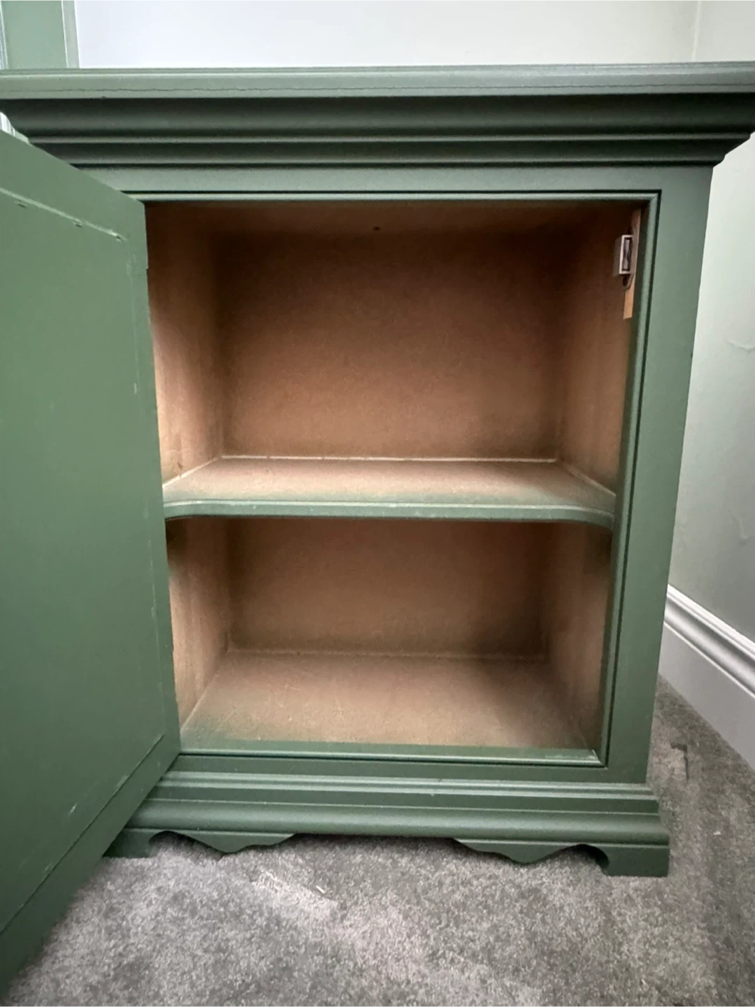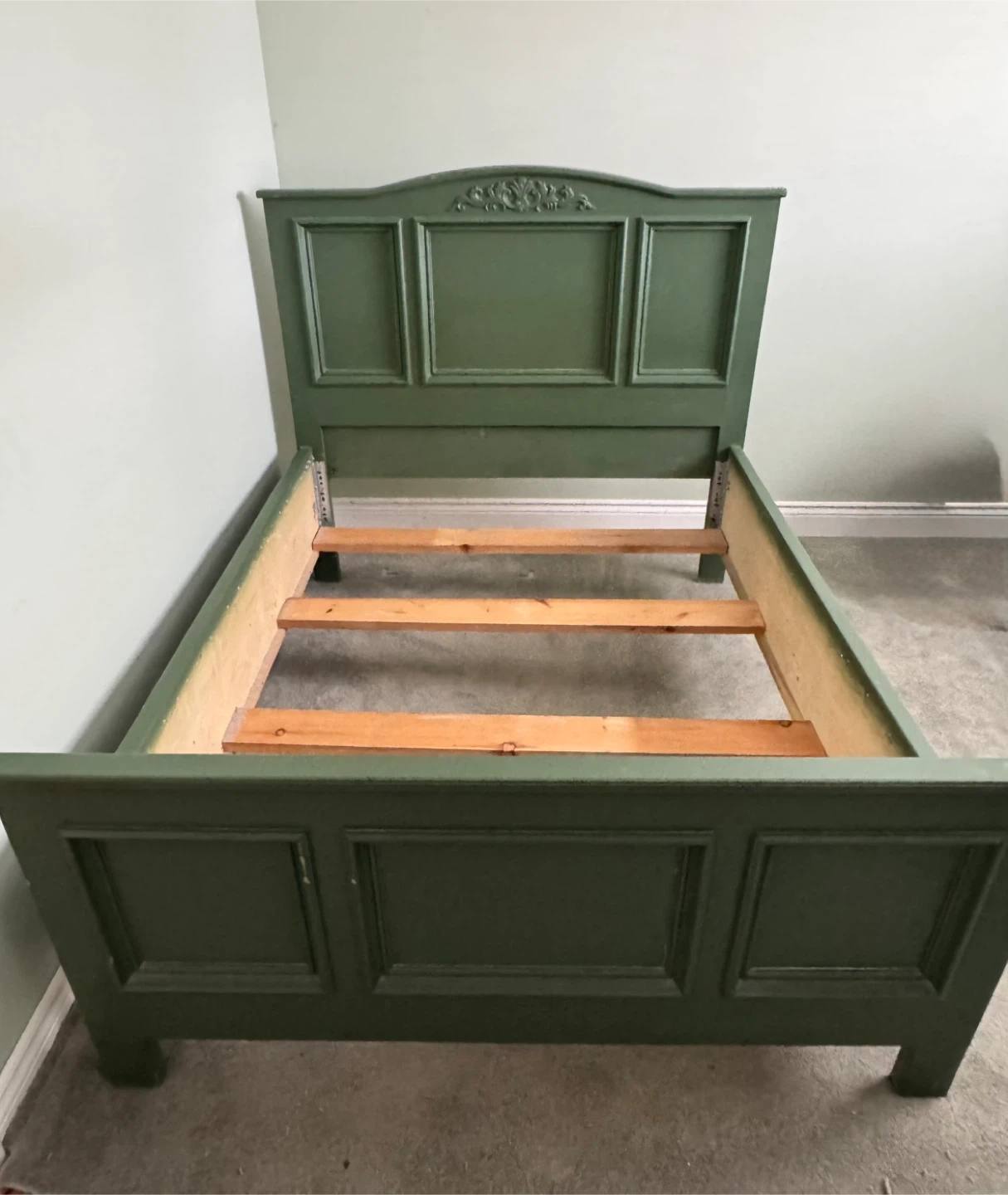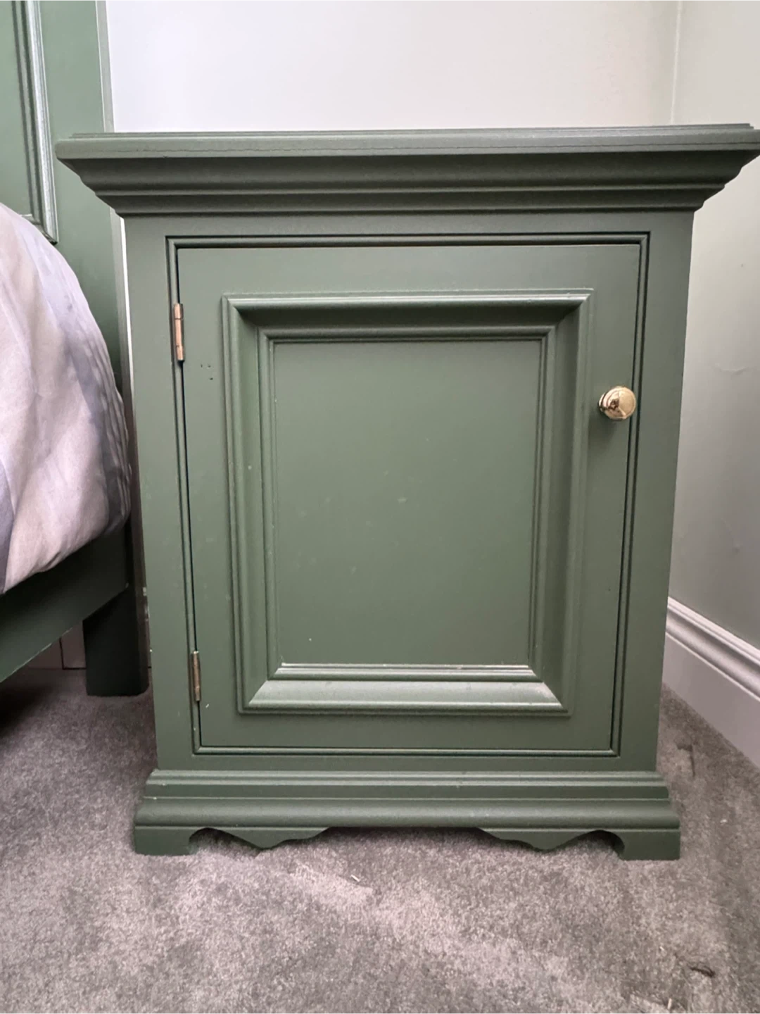 Double bed with 2 matching green nightstands and a tall dresser with gold hardware. The nightstand has one door with shelves inside, and the dresser has six drawers for storage. Both pieces have a classic, traditional design with decorative trim. Includes shelf and 2 pictures.