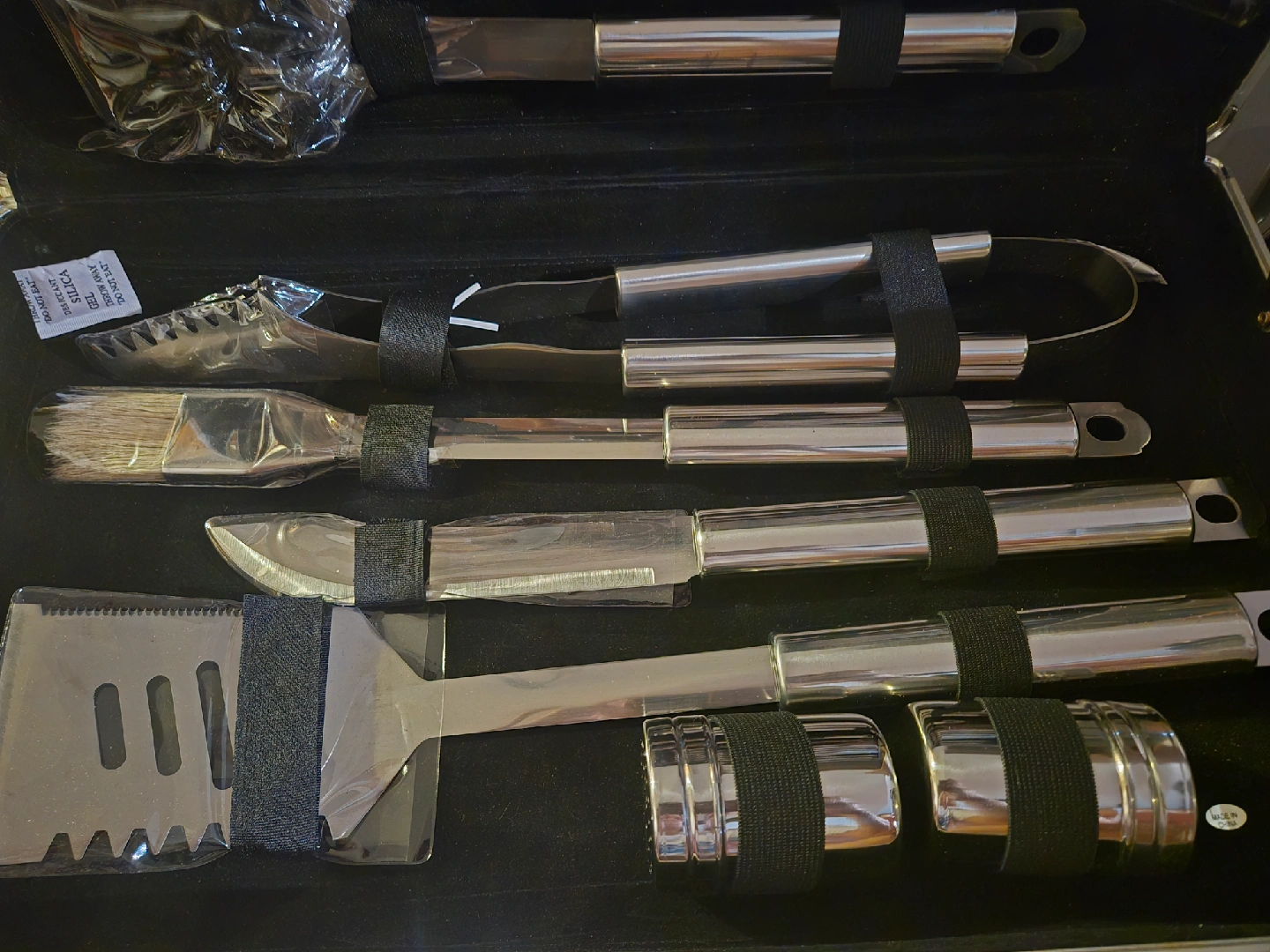 Selling a complete BBQ grill tool set, neatly organized in a sturdy aluminum case! This set includes everything you need for grilling, from spatulas and tongs to knives and brushes. Perfect for summer cookouts and outdoor entertaining! All the tools are in great shape and ready to use