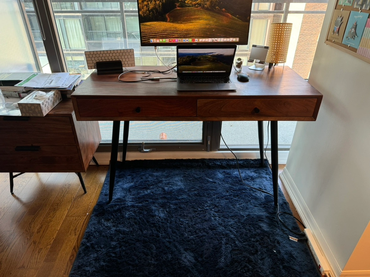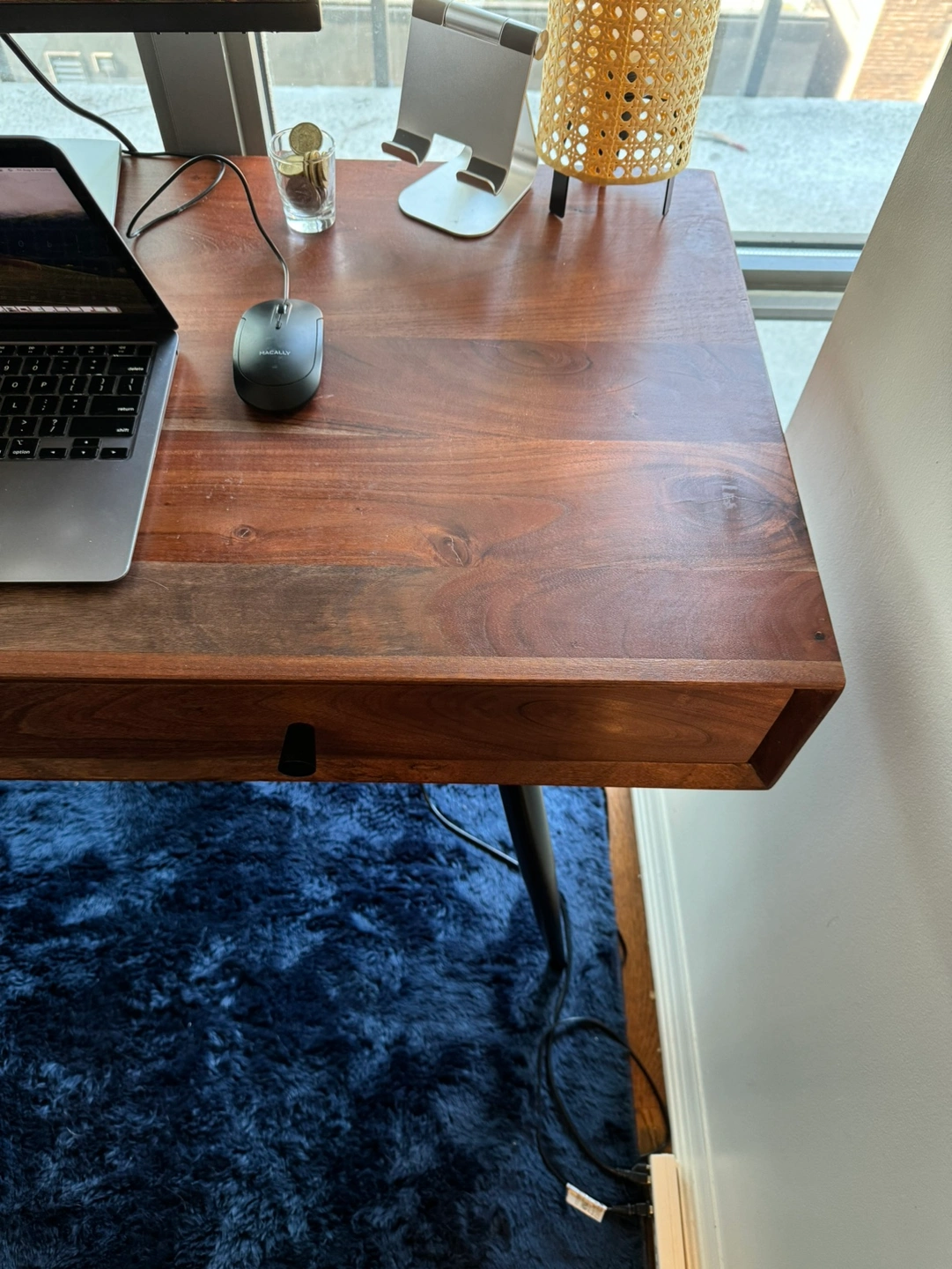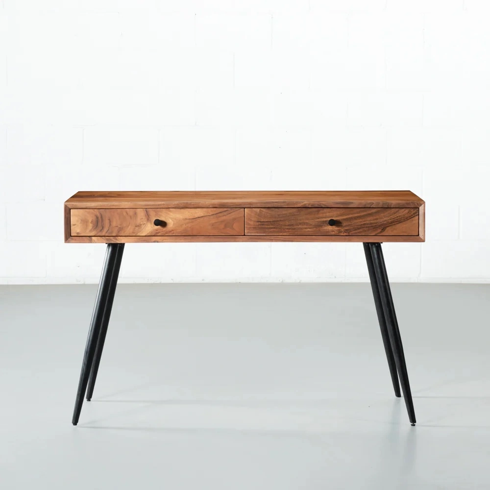 This desk is in excellent condition and is perfect for any home office. It features two drawers and a sleek mid-century design. It is made from solid wood and has black metal legs. Here’s the original listing: https://www.wazofurniture.com/products/foster-acacia-writing-desk.