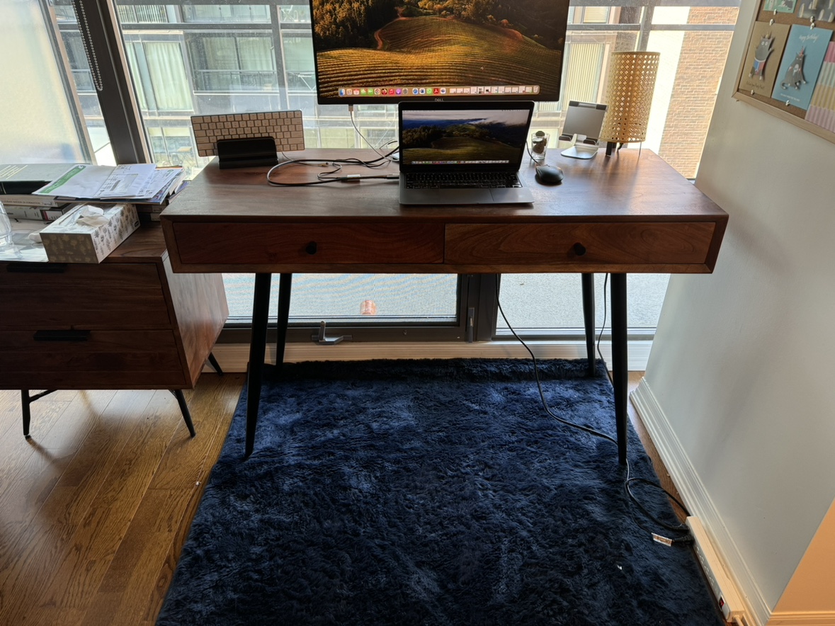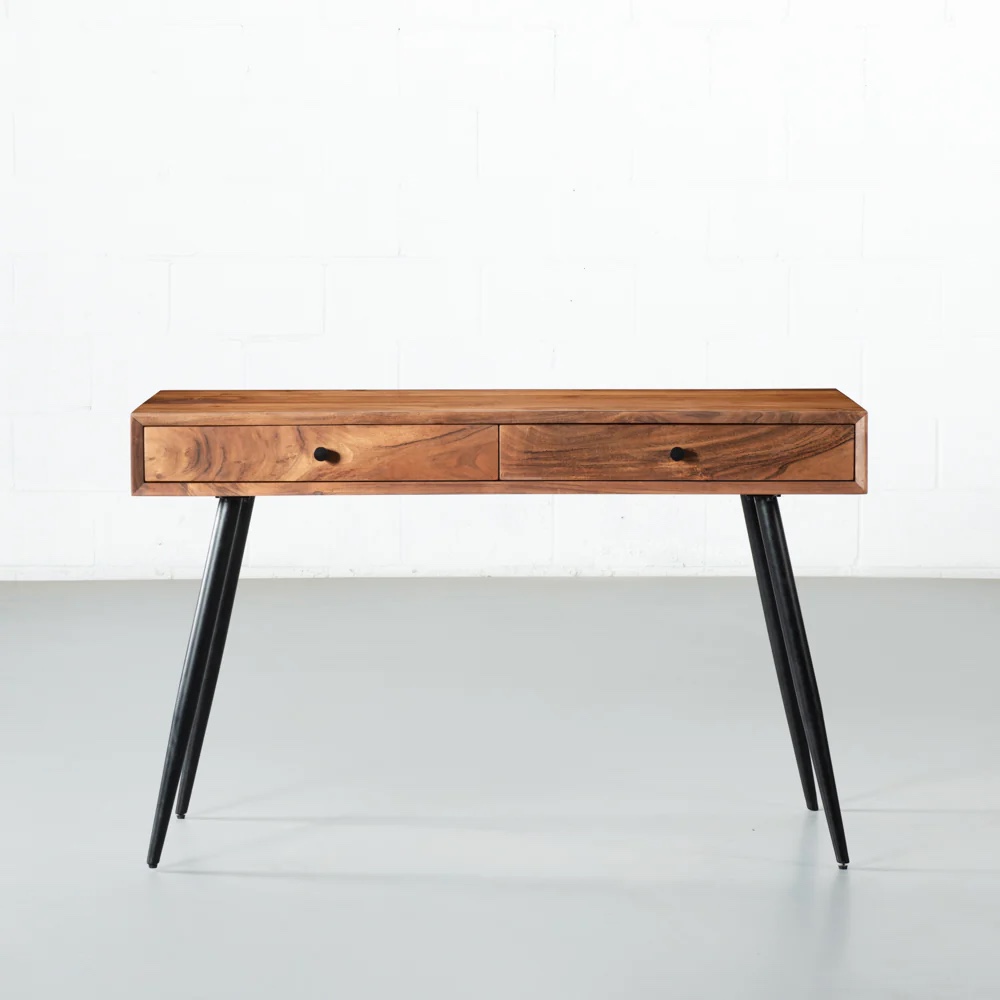 This desk is in excellent condition and is perfect for any home office. It features two drawers and a sleek mid-century design. It is made from solid wood and has black metal legs. Here’s the original listing: https://www.wazofurniture.com/products/foster-acacia-writing-desk.