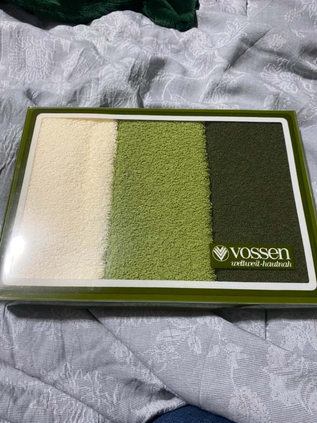 This is a set of three Vossen hand towels, each measuring 30x50 cm. They're made from 100% cotton. These towels are made in West Germany.