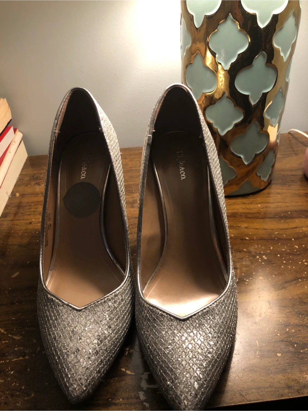 Sparkly silver glitter heels from Style & Co. These pumps have a pointed toe and a comfortable heel height. They're a dazzling addition to any outfit!had to take the Price tag