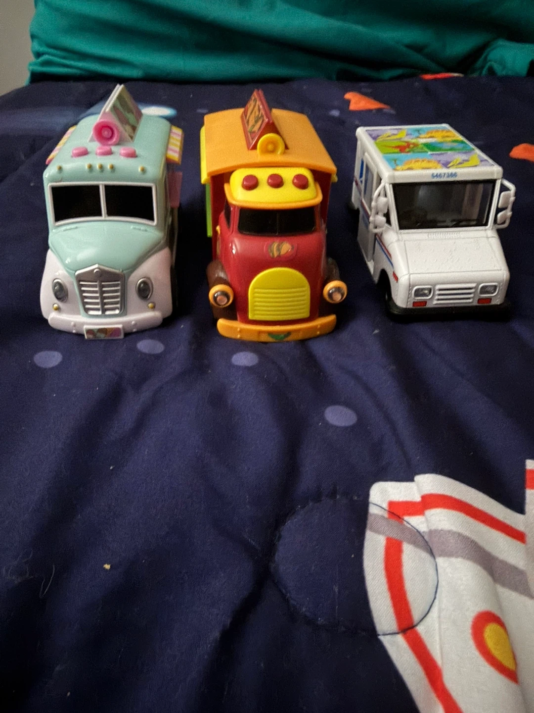 Selling a lot of Brio light up food trucks. Includes an ice cream truck, mail truck, and taco truck. Great for kids! They play songs and beep.