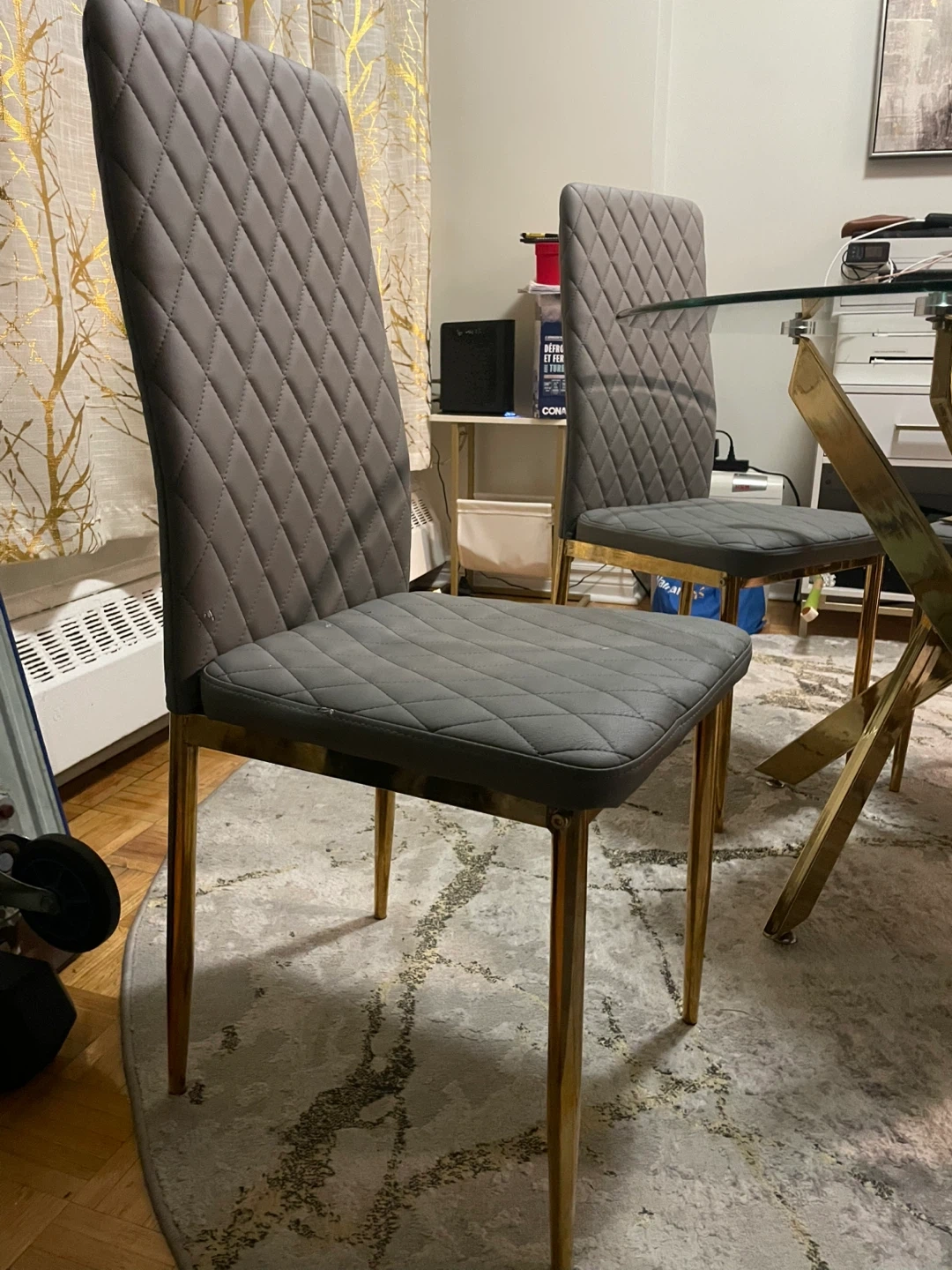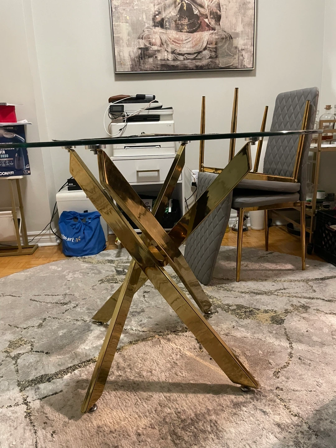 This set includes a round glass-top dining table with a striking gold-tone X-base and four upholstered grey dining chairs. The chairs have diamond-stitched detailing and gold legs that complement the table base. It's a stylish set for a dining area. Chairs are upholstered in a grey faux leather.