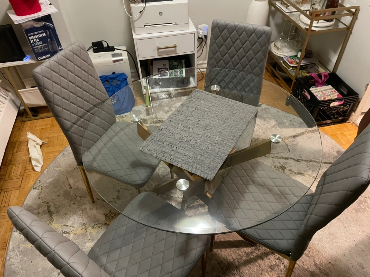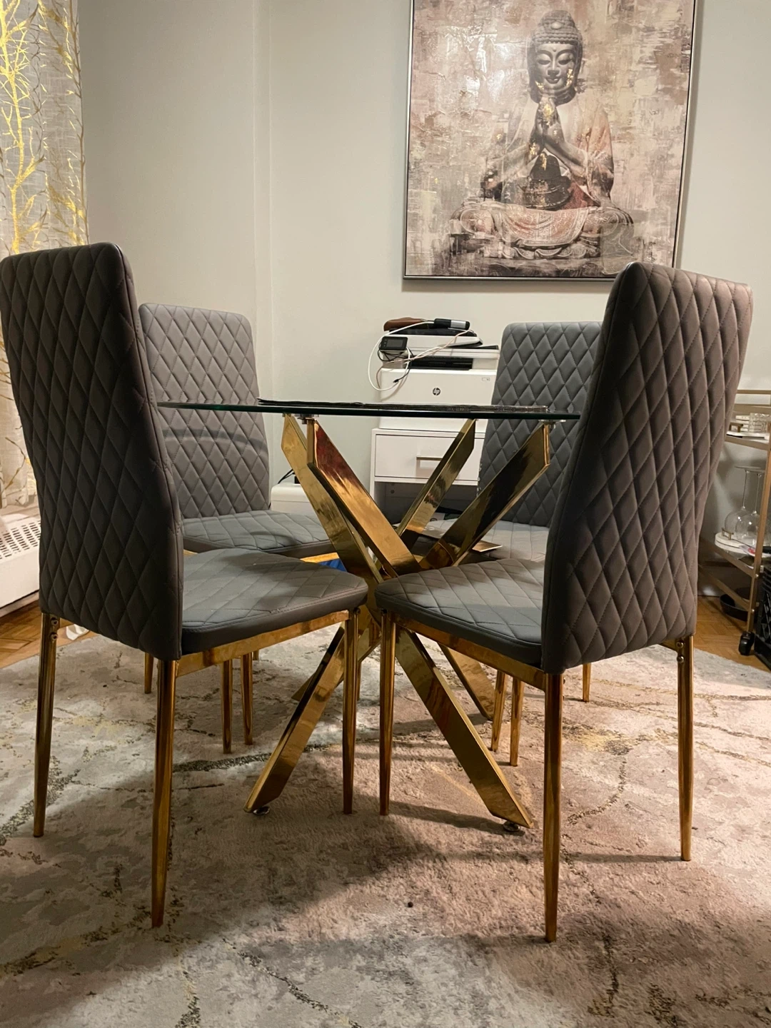 This set includes a round glass-top dining table with a striking gold-tone X-base and four upholstered grey dining chairs. The chairs have diamond-stitched detailing and gold legs that complement the table base. It's a stylish set for a dining area. Chairs are upholstered in a grey faux leather.