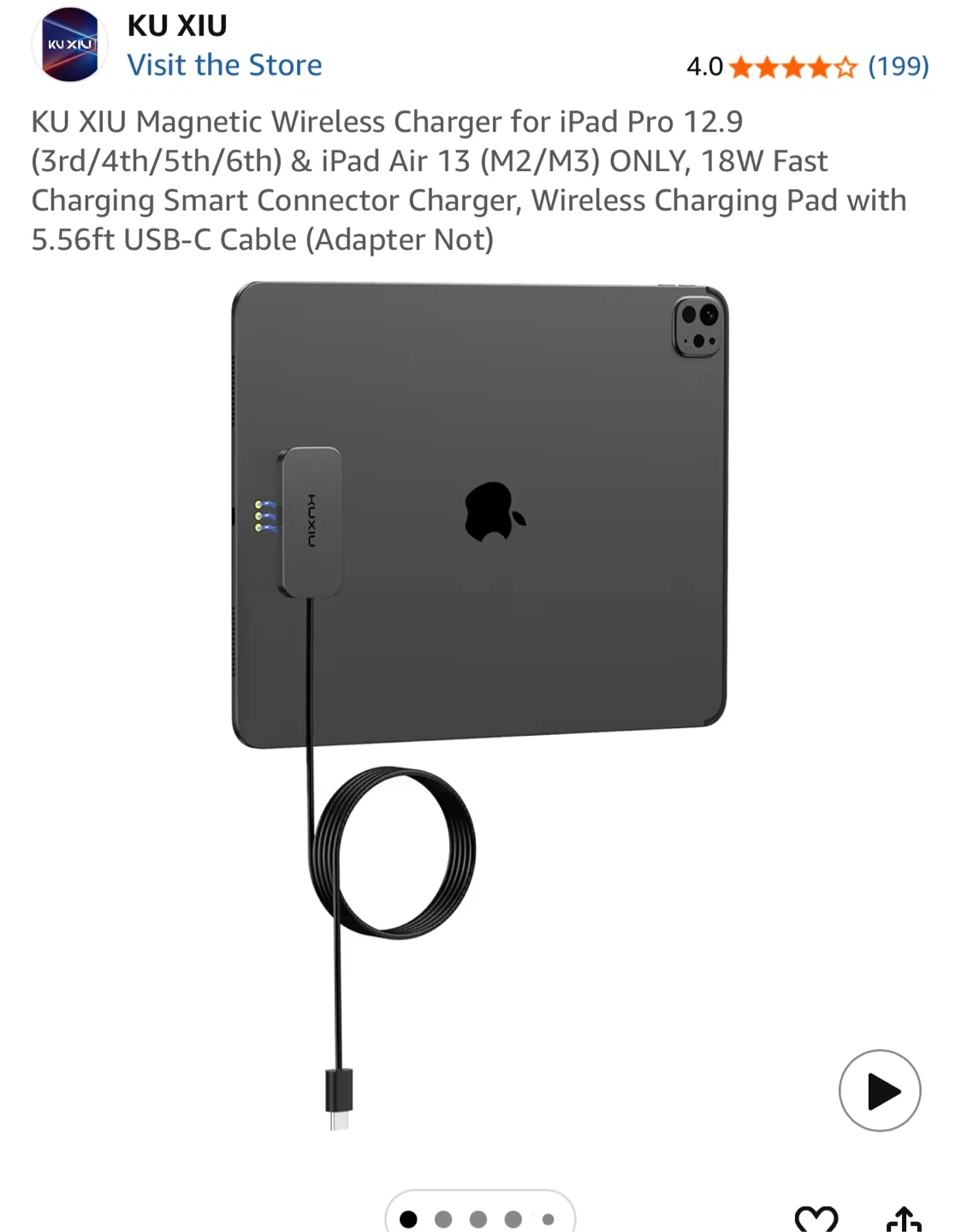 This magnetic wireless charger is designed for iPad Pro 12.9 and iPad Air 13. It features an 18W fast charging pad with a 5.56ft USB-C cable. The charger connects magnetically for easy placement.