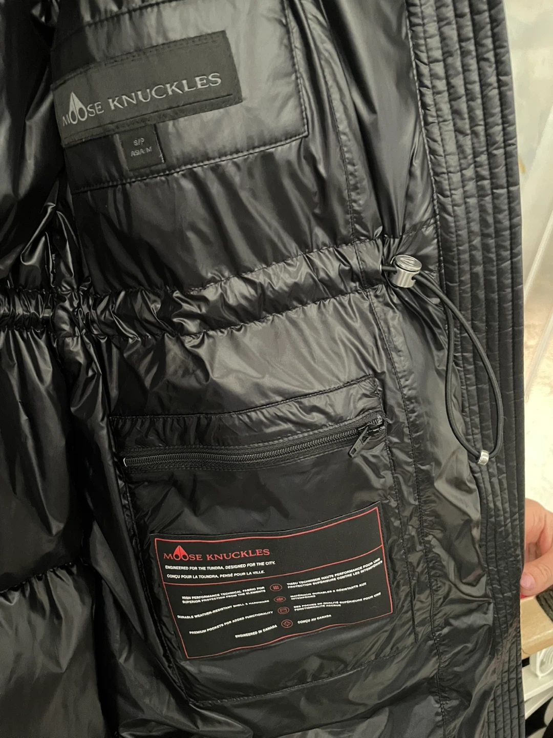 This is a Moose Knuckles Juniper Parka in black, size small. It features premium down for superior warmth and a water-resistant shell. Made in Canada. Original price $ 1095.00