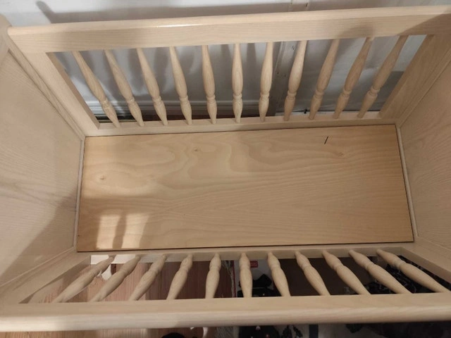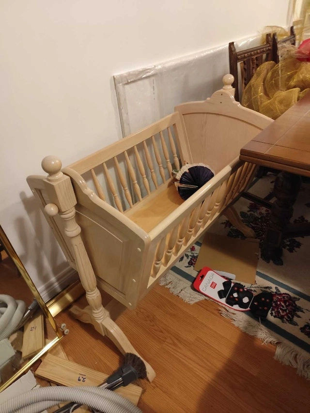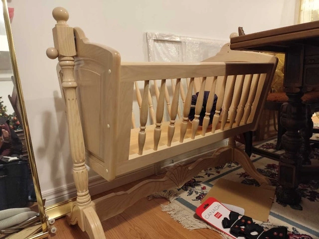 Hand made cradle solid oak. Measures 21" x 37" inches at the top. 34" inches high. 12" x 32" inside bottom. $300 or best offer. Located near Mavis and Derry road Mississauga.