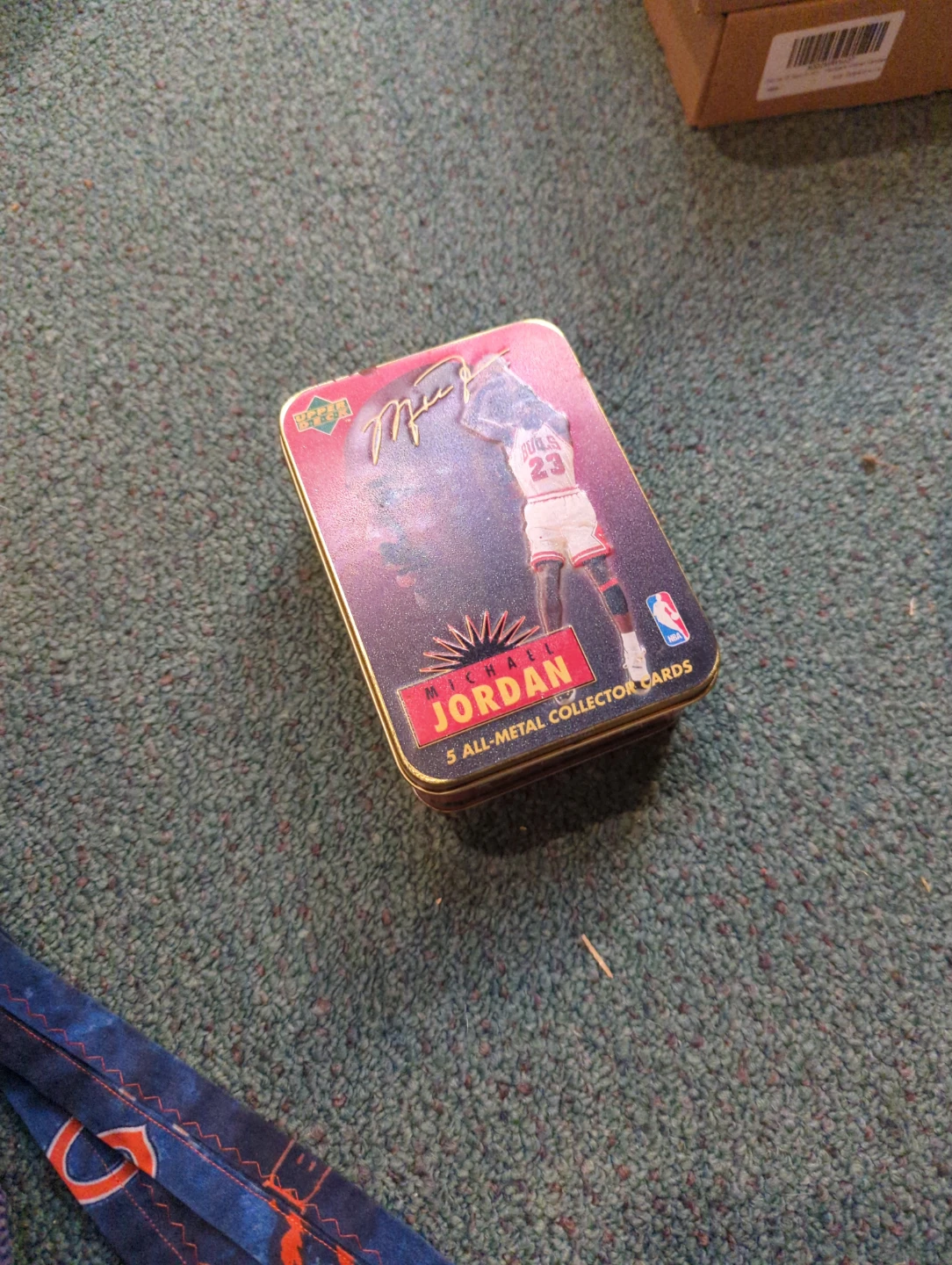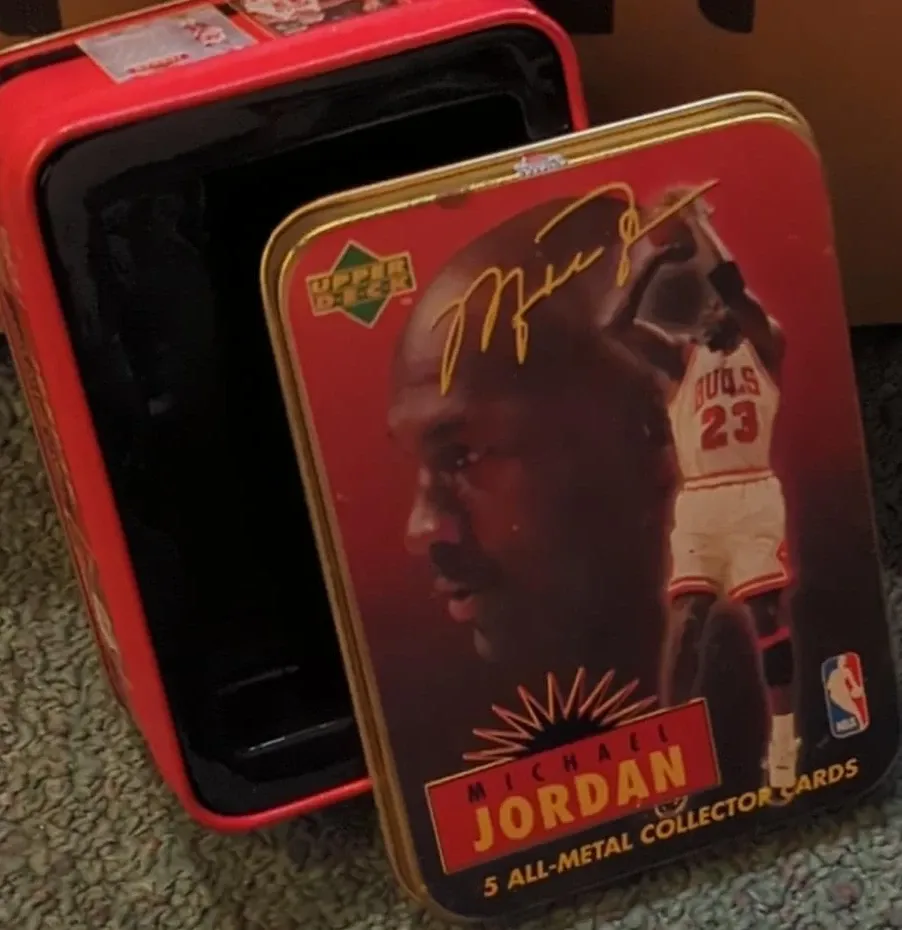 This is an Upper Deck tin featuring Michael Jordan. It contains 5 all-metal collector cards. The tin has a hinged lid for storage.
