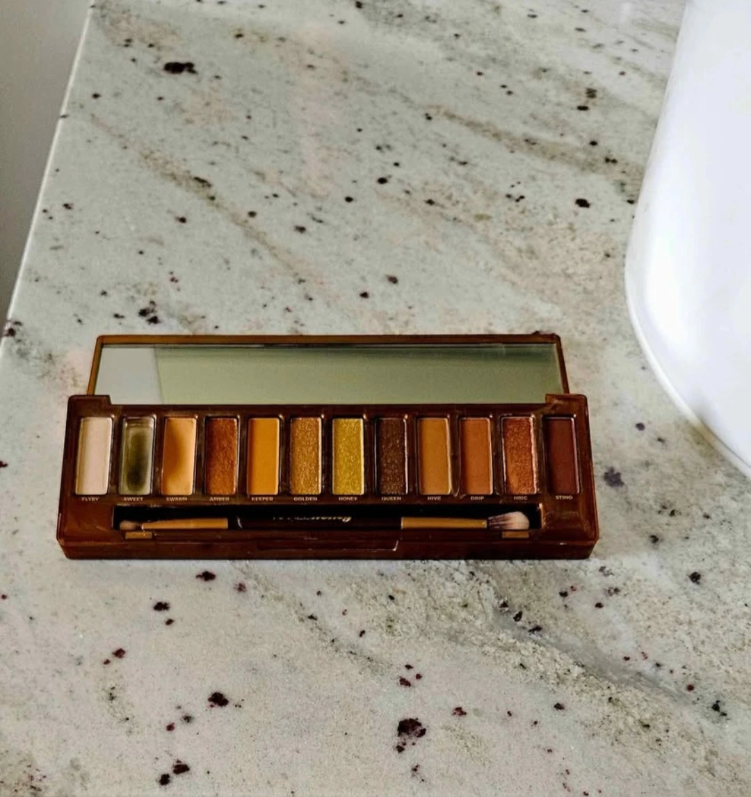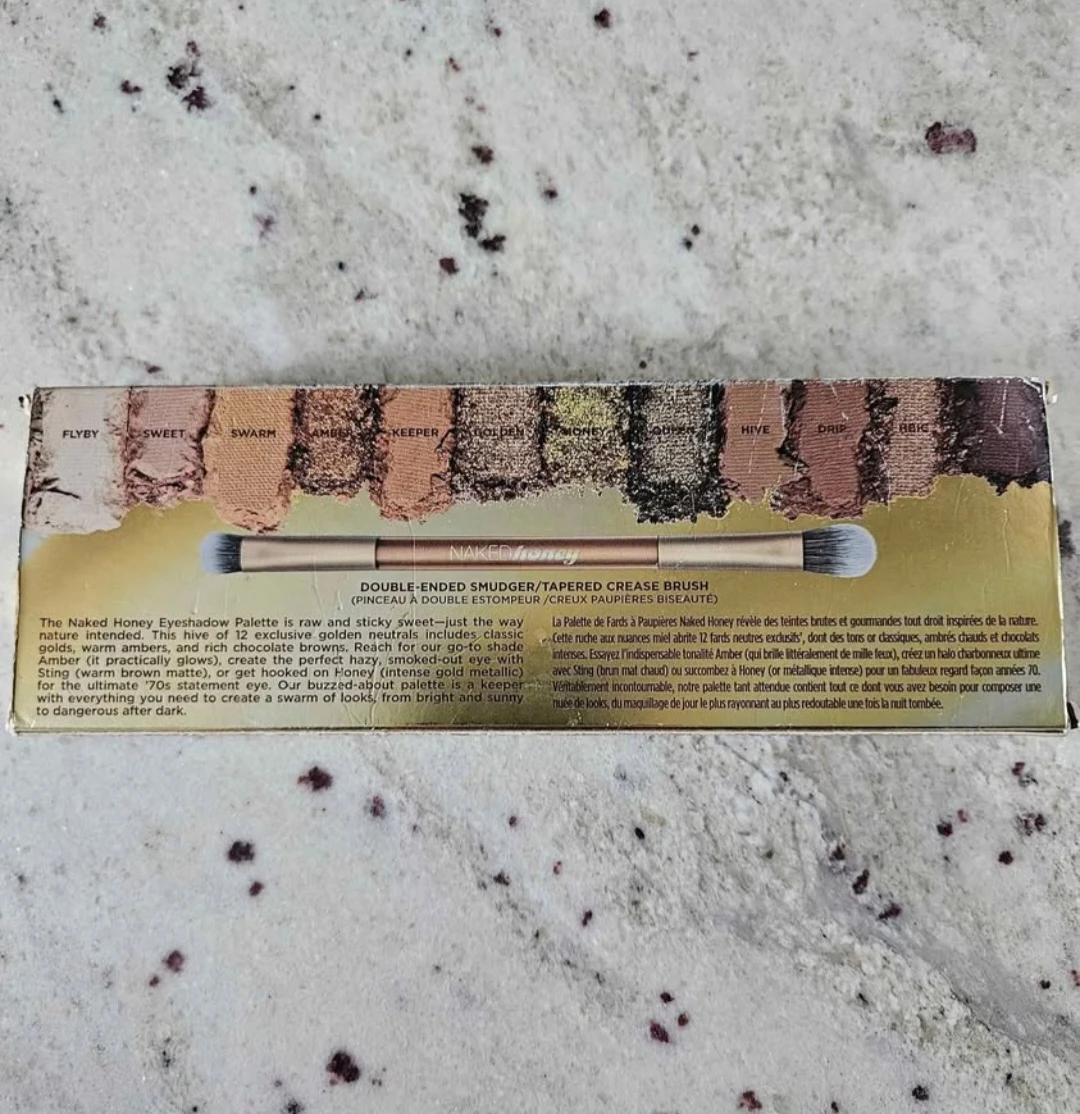 Urban Decay Naked Honey Eyeshadow Palette. Includes 12 exclusive golden neutrals. Comes with a double-ended brush. ('Sweet' eyeshadow broke so it's missing from the palette.)