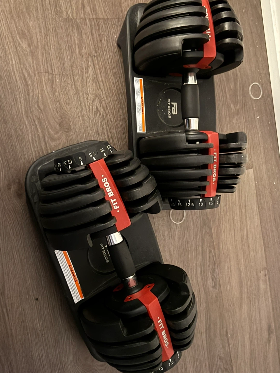 Selling a pair of Fit Bros adjustable dumbbells. They are in excellent condition and ready for your home gym! The weight is adjustable from 5 to 52.5lbs