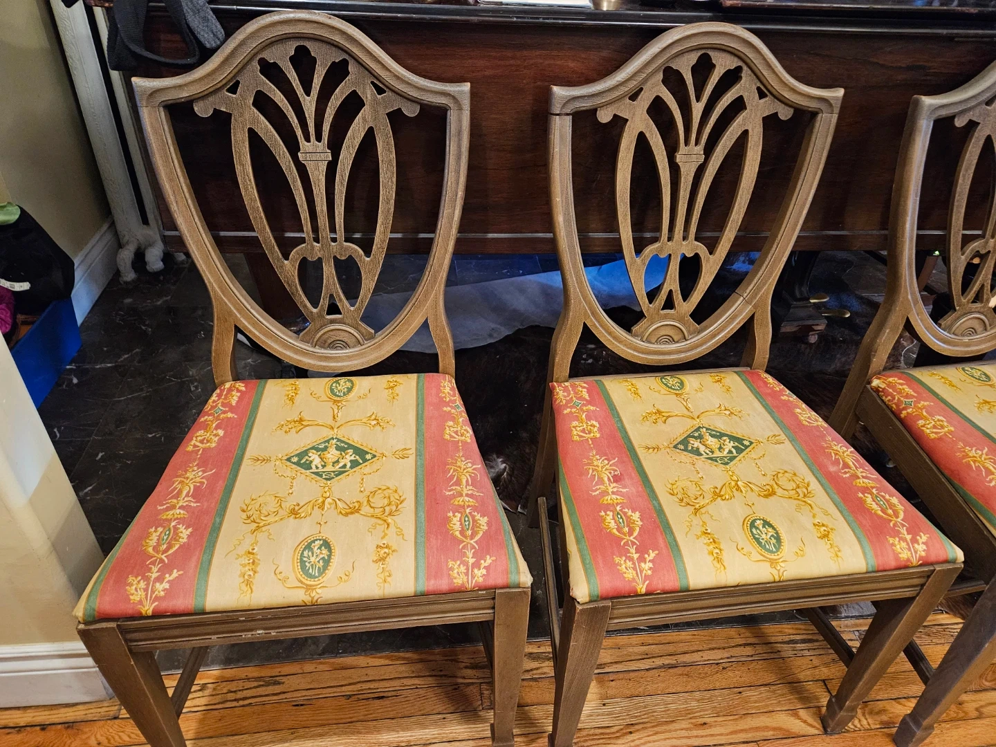 Set of four dining chairs featuring a detailed fabric seat pattern. The wooden frames show some minor wear consistent with age, one has flaw, see photo for detail. These chairs add a touch of classic style to any dining space.