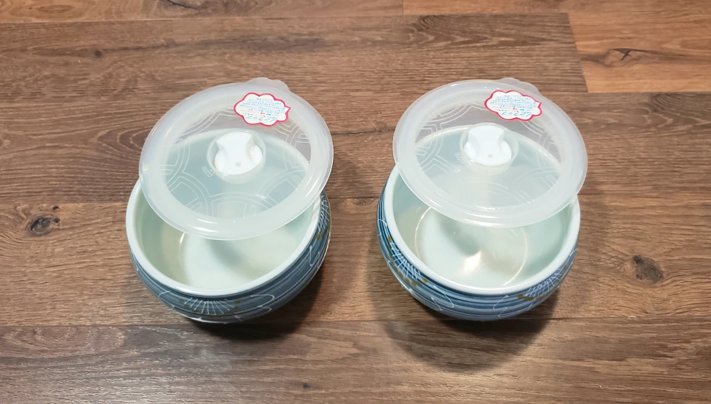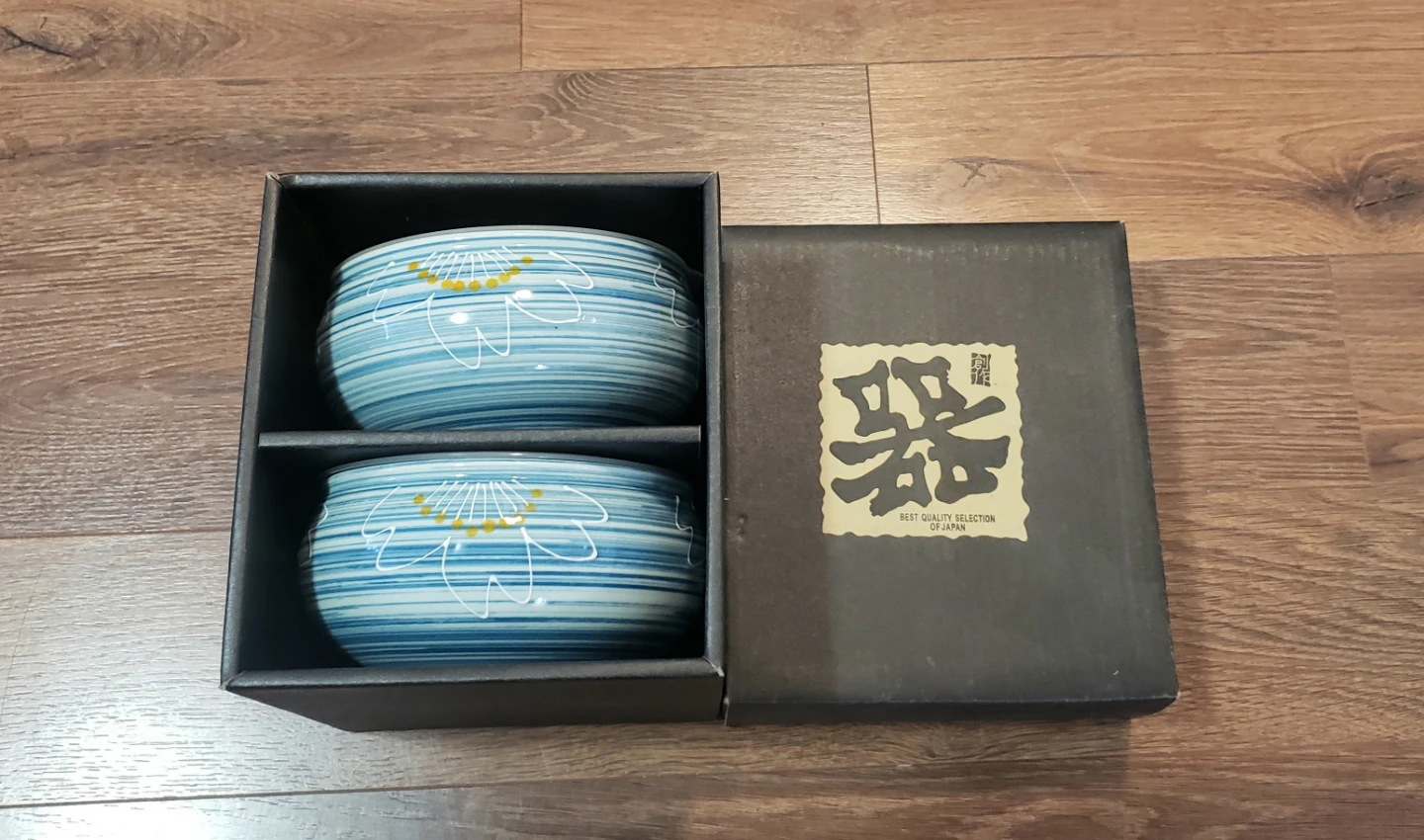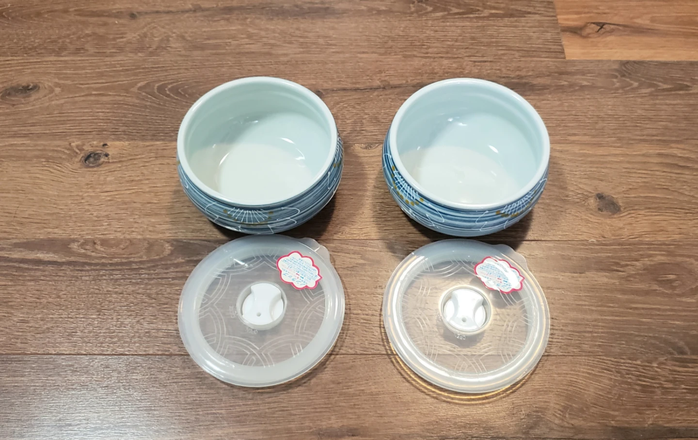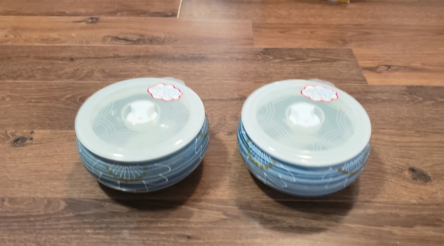 Beautiful set of two ceramic bowls, featuring a blue and white striped design with floral accents. Each bowl comes with a clear, airtight lid. Imported as a best quality selection from Japan.
