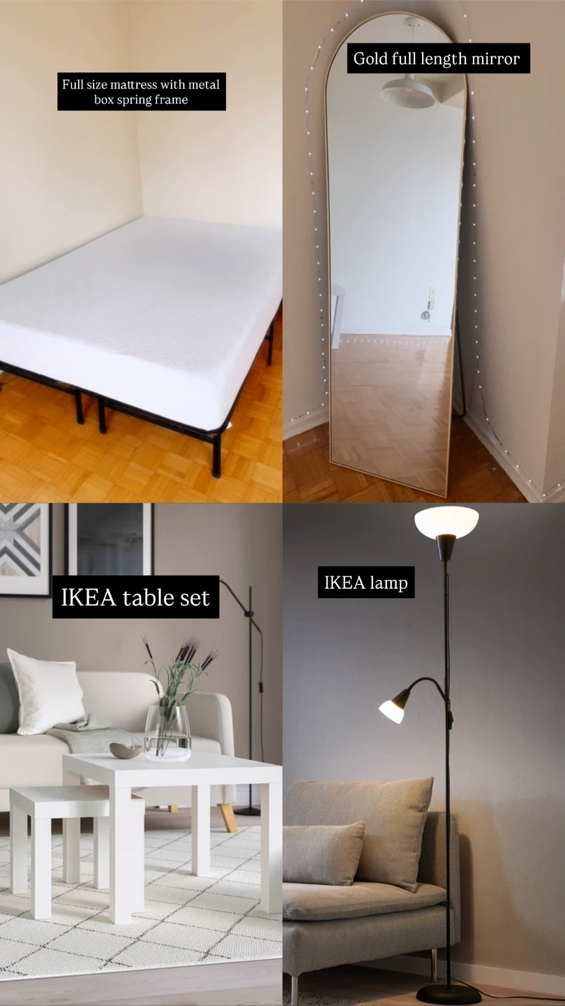 This IKEA table set includes a full-size mattress and a metal box spring frame. Also available is a gold full-length mirror. A multi-purpose IKEA lamp is also part of this listing.
