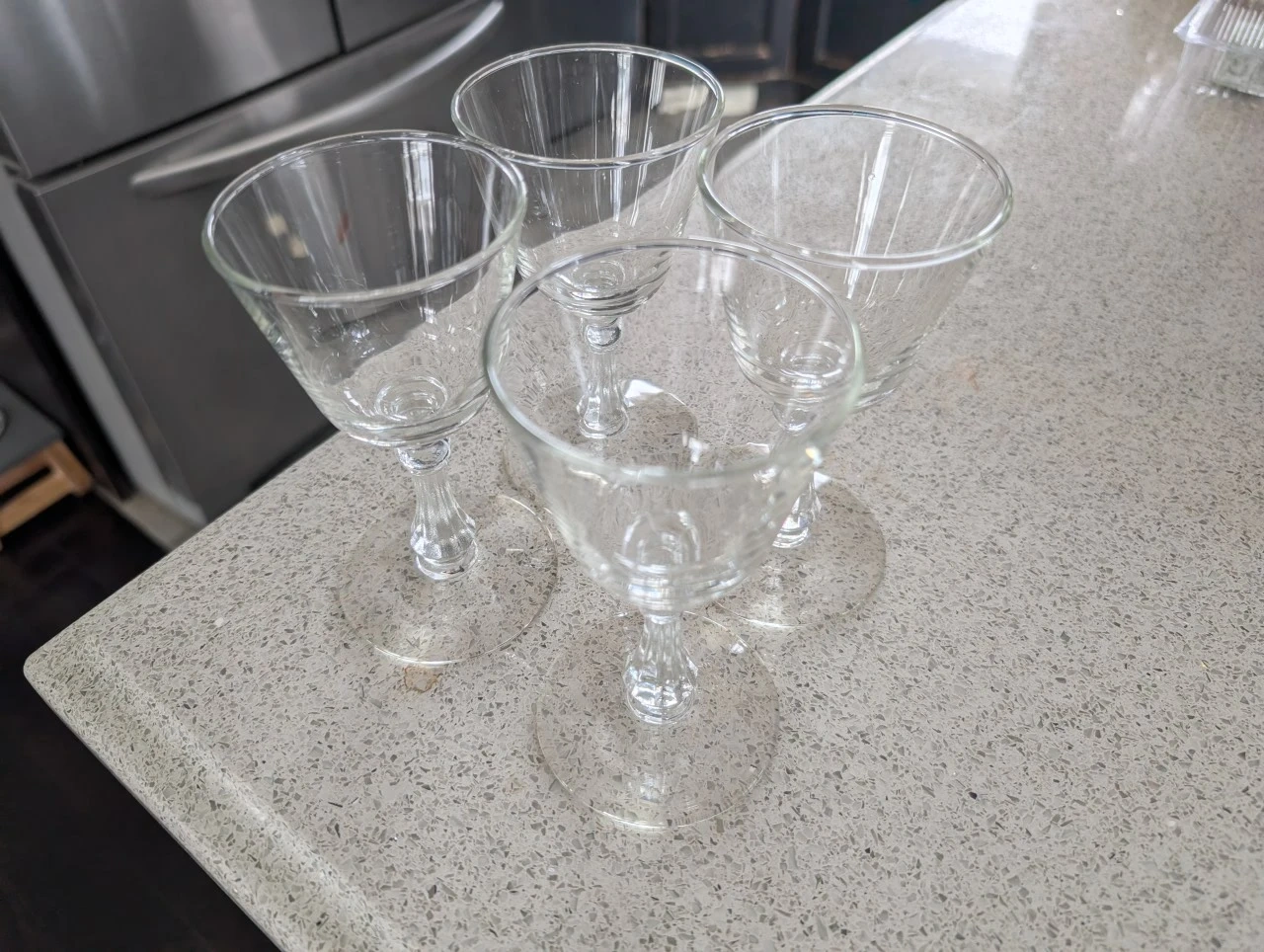 A set of four clear glass cocktail glasses. These glasses are made of glass and have a delicate stem design. Perfect for serving small cocktails or aperitifs.