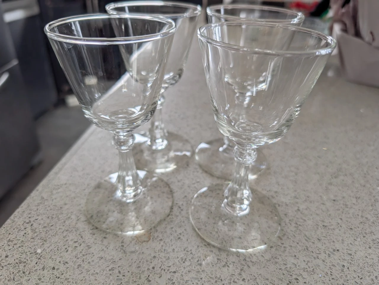 A set of four clear glass cocktail glasses. These glasses are made of glass and have a delicate stem design. Perfect for serving small cocktails or aperitifs.