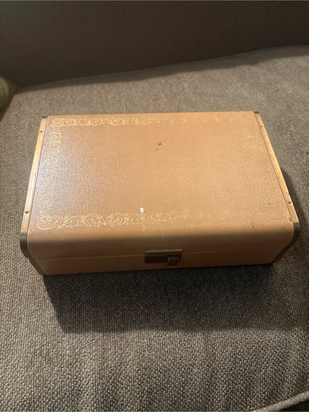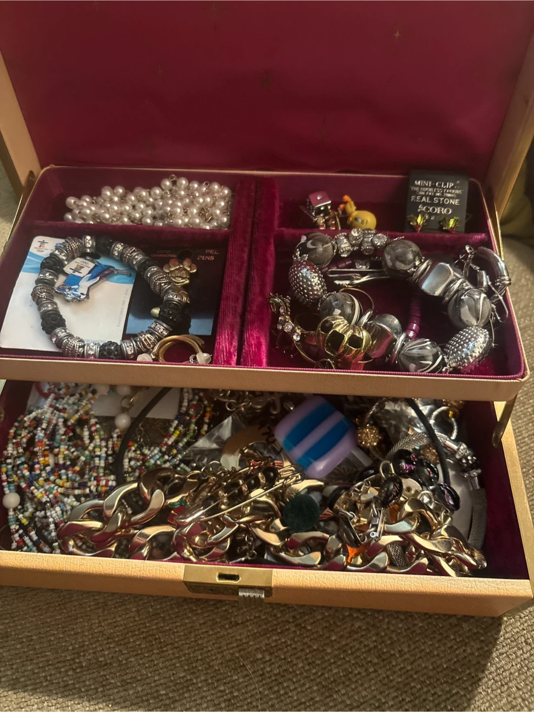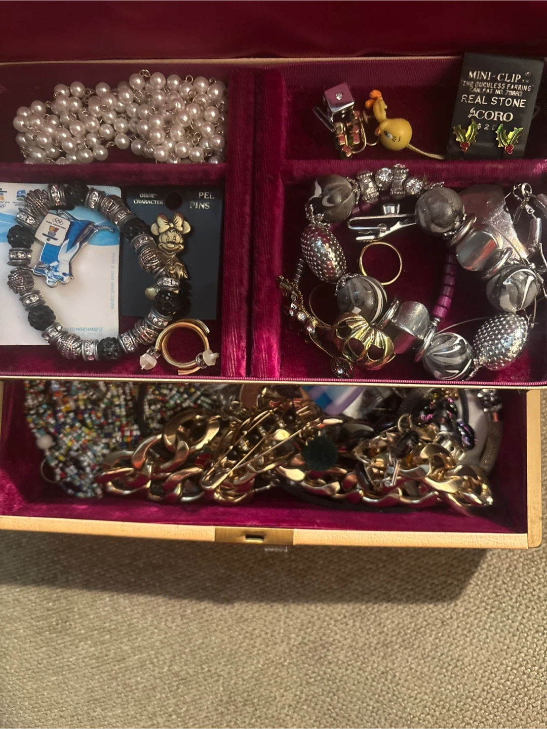 A vintage jewelry box filled with a variety of costume jewelry pieces. It includes necklaces, bracelets, earrings, and rings. This collection offers a wide range of styles for everyday wear or special occasions. Silver and brand name items in the mix