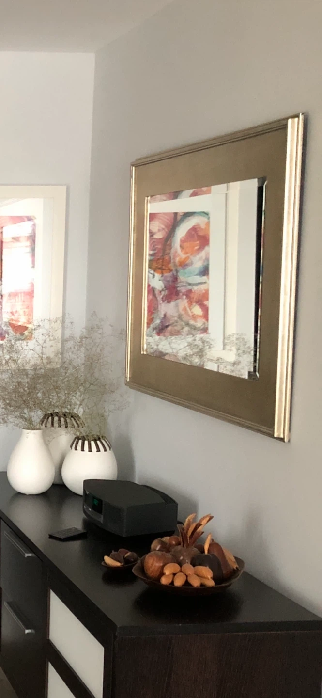 Selling a lovely gold-framed wall mirror. It's approximately 41.5 inches by 29.5. Could be hang either way. The frame has a distressed look that gives it a unique and interesting look.