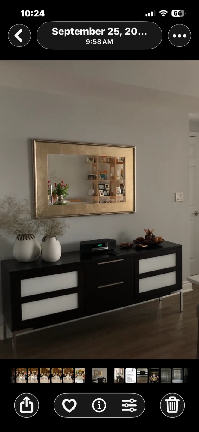 Selling a lovely gold-framed wall mirror. It's approximately 41.5 inches by 29.5. Could be hang either way. The frame has a distressed look that gives it a unique and interesting look.