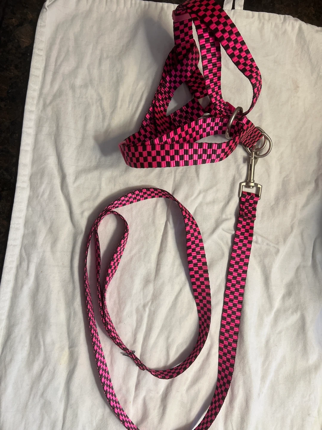 This is a dog leash and harness set with a pink and black checkered pattern. It's made of nylon webbing and includes a sturdy metal clasp for the leash.