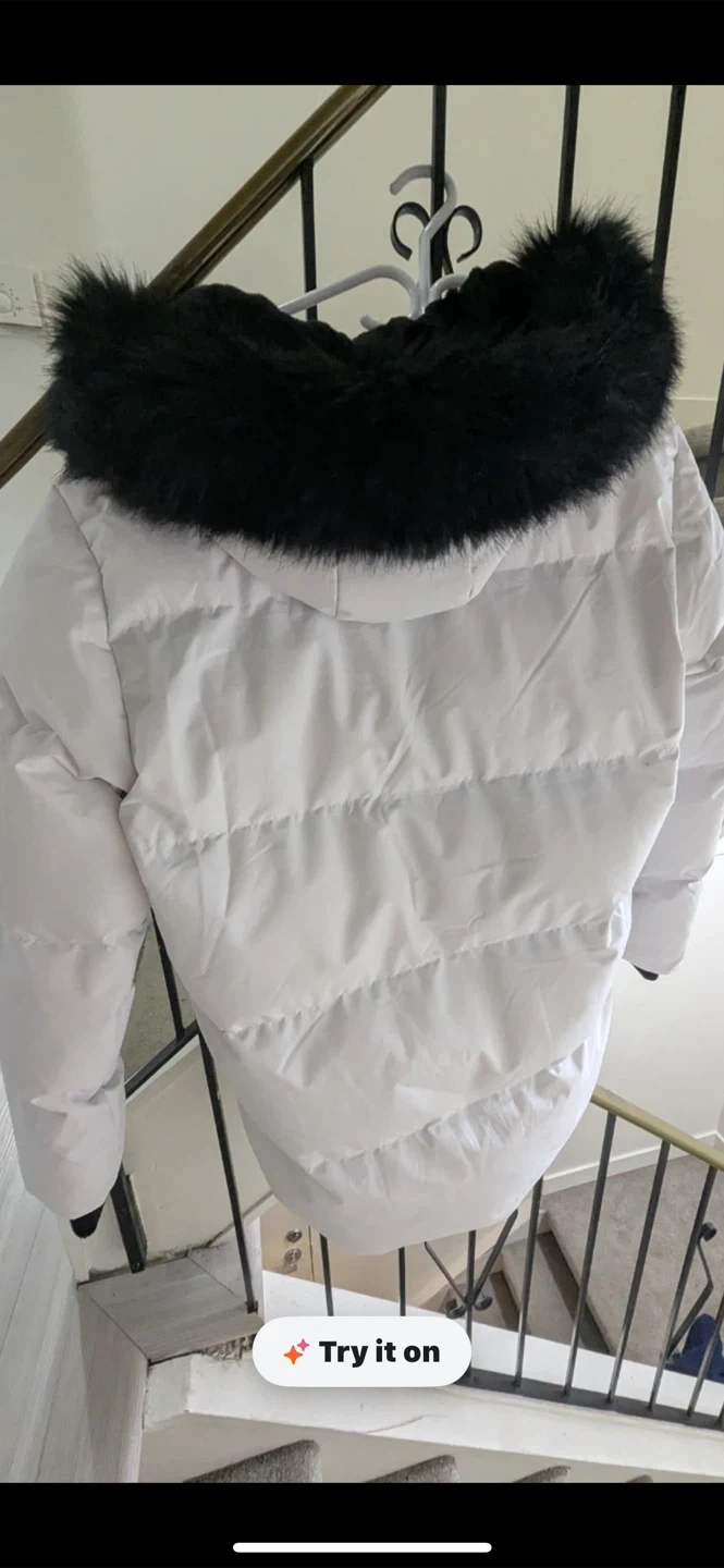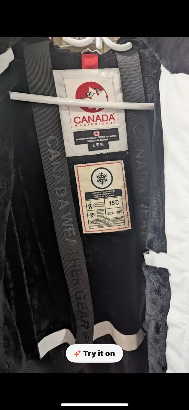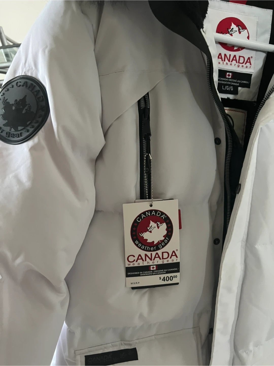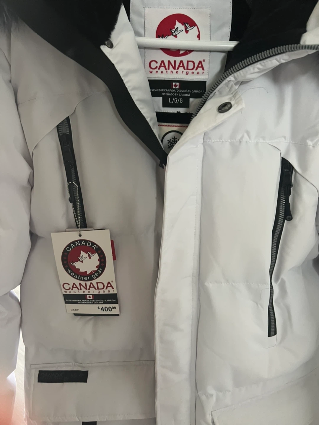 This white puffer parka jacket by Canada Weathergear is a size L/G. It's designed for cold weather with a fur-trimmed hood. It's in great condition! Very beautiful just to small to my husband