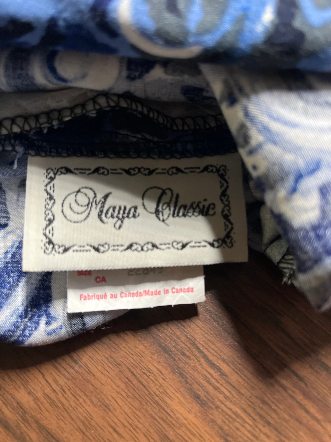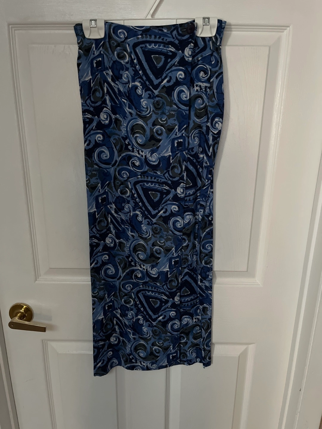Blue and grey wrap skirt with a geometric pattern. Made in Canada. Length is 34”