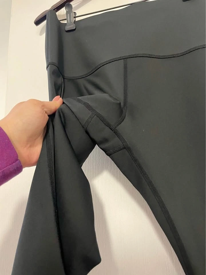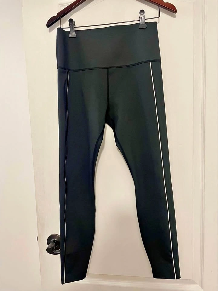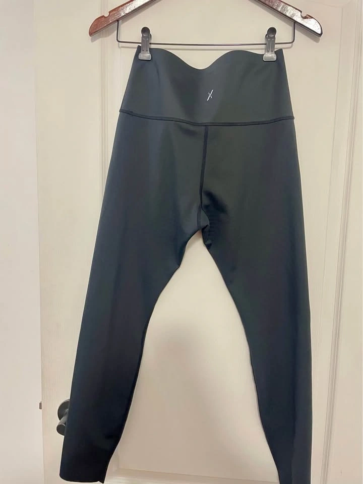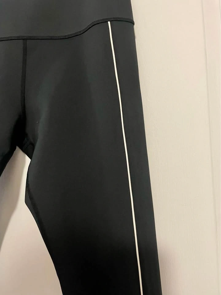 Stylish black high-waisted leggings. Has white stripe detail on sides. X logo on back waistband. Fabric is smooth and comfy. Great for workouts or just chilling.