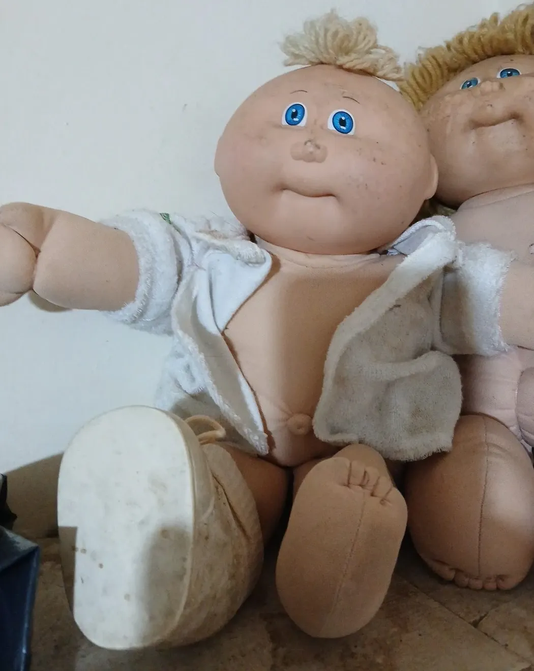 This is a classic Cabbage Patch Kid doll with blue eyes and blonde hair. It's wearing a white terry cloth robe and white shoes. The doll is made of soft fabric and vinyl.