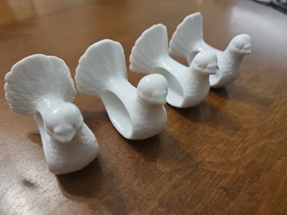 Beautiful set of 4 white ceramic dove napkin rings. Gloss finish with lovely feather detail. Perfect for spring tables, Easter, weddings, or farmhouse-style decor. In excellent condition. No chips or cracks. Approx. 3" long x 2" high. Super cute for hosting or gifting! $25 for the set. Pick up 208 & 57 Langley.