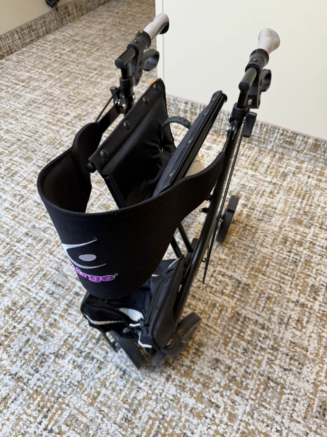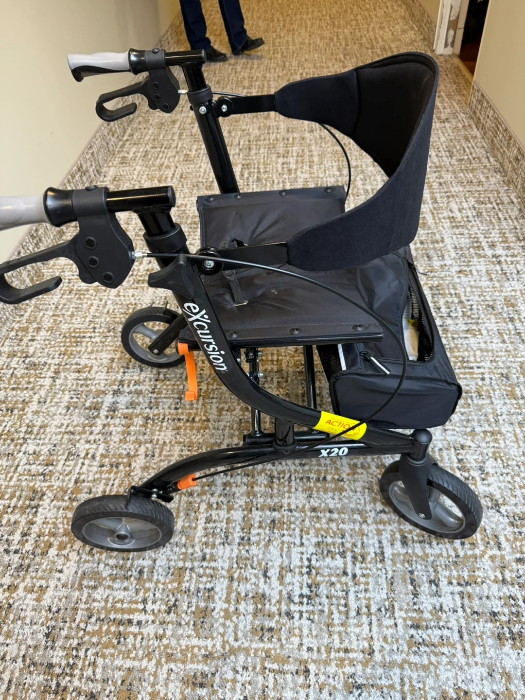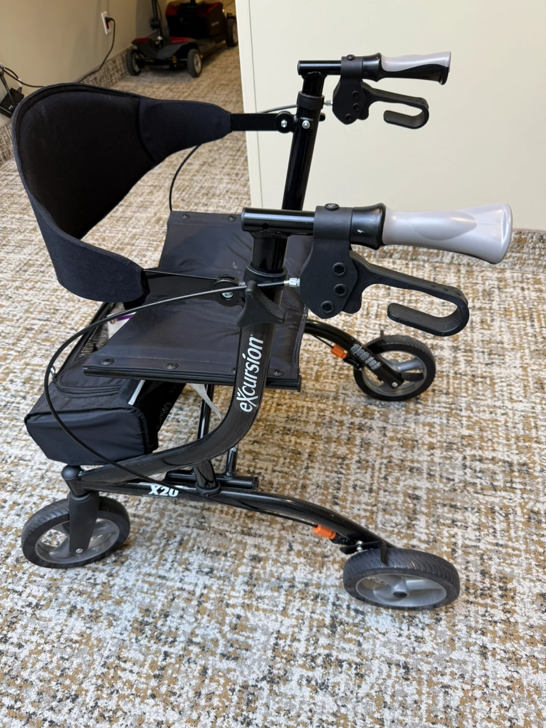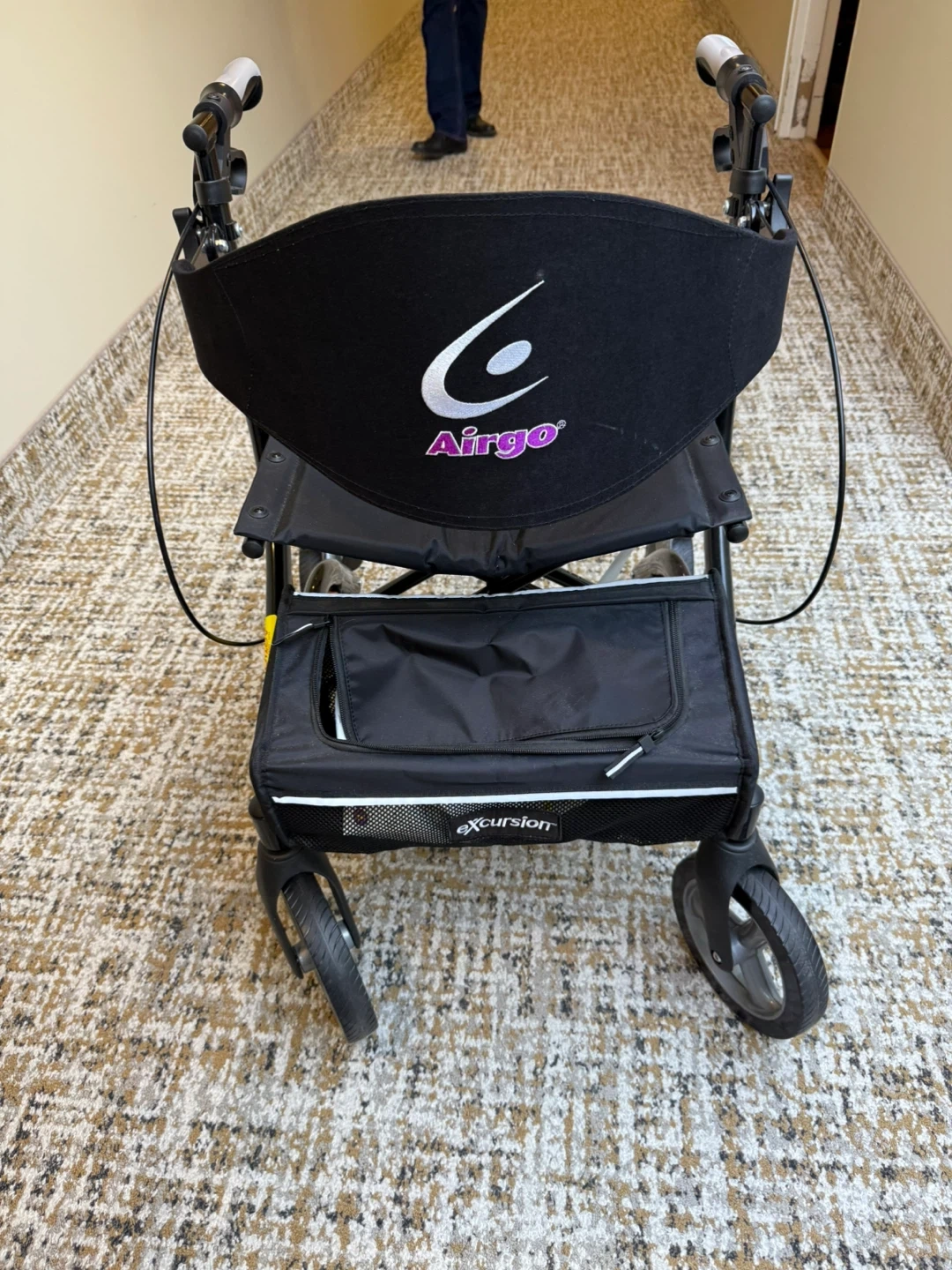 This is an Airgo Excursion X20 walker. It features a seat and storage bag. Built for mobility assistance. This Airgo Excursion X20 walker Purchased new and never used! 4 wheel very solid walker that folds nicely. Very sturdy and smooth. Brakes work great with great comfortable handles. Nice storage compartment . Compare at over $500. Asking $160 and can deliver locally