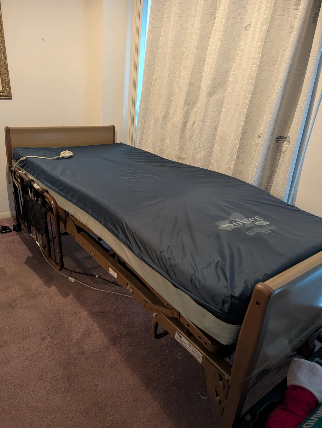 Invacare hospital bed with a SoliGrip mattress. This bed features adjustable height and backrest for patient comfort. It's in good condition and includes a functional remote control. Useful for home care or recovery.