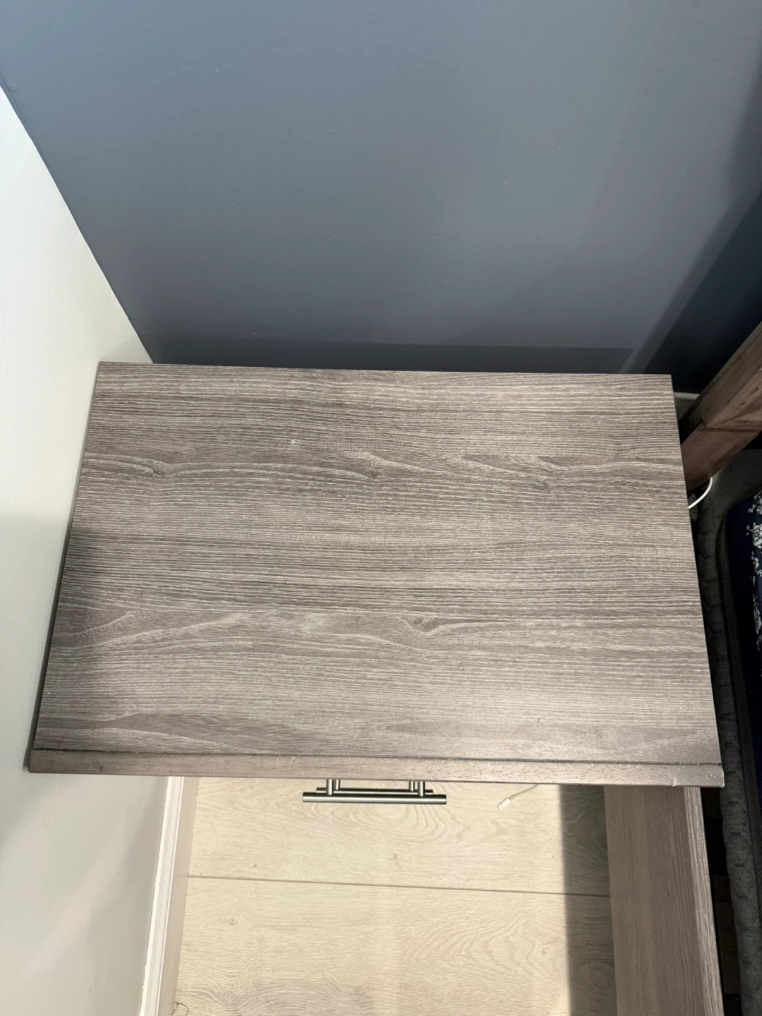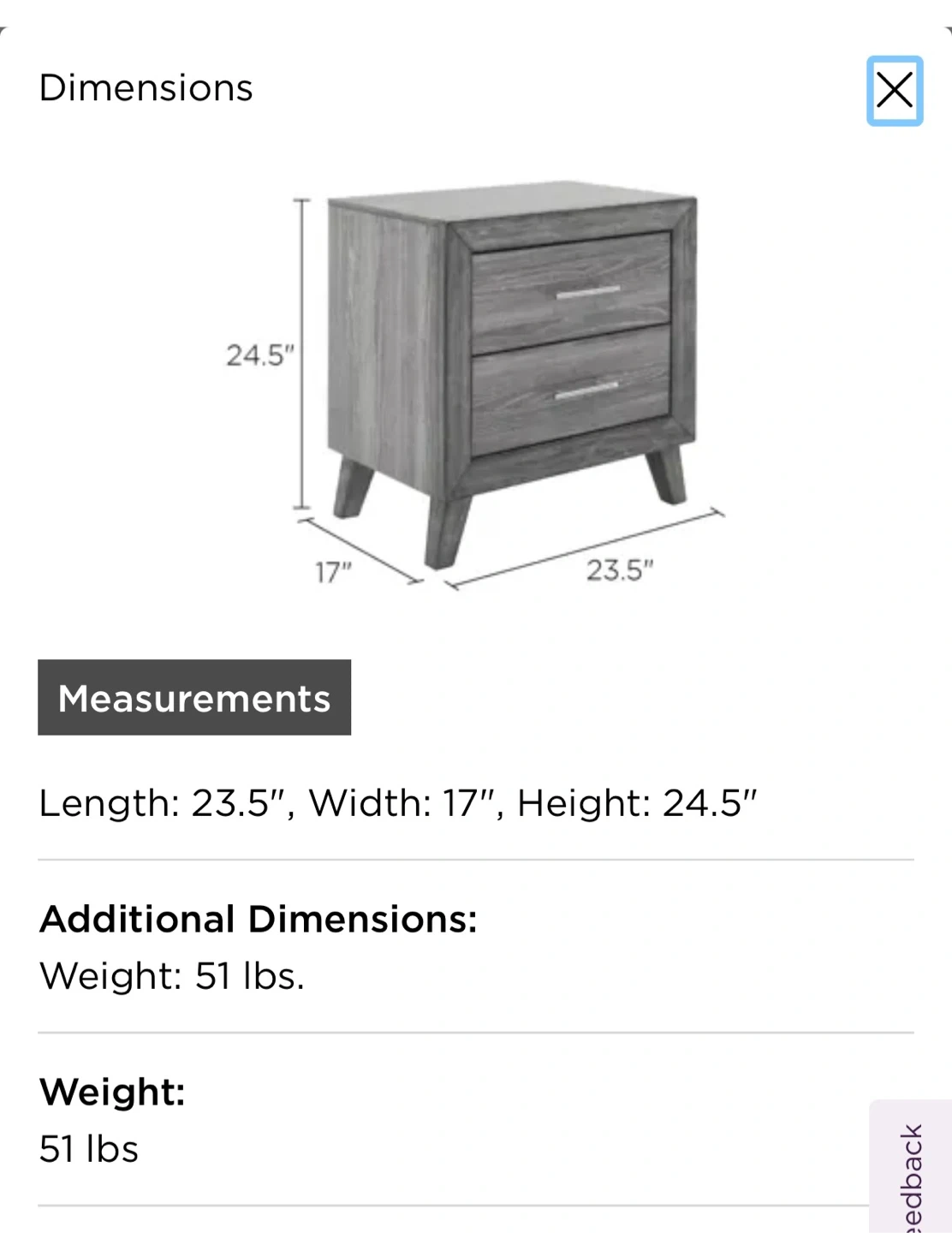 This nightstand has a grey wood finish and two drawers for storage. It's 24.5 inches tall, 17 inches wide, and 23.5 inches long. The nightstand weighs 51 lbs. I have two nightstands, let me know if interested I will give you a deal.