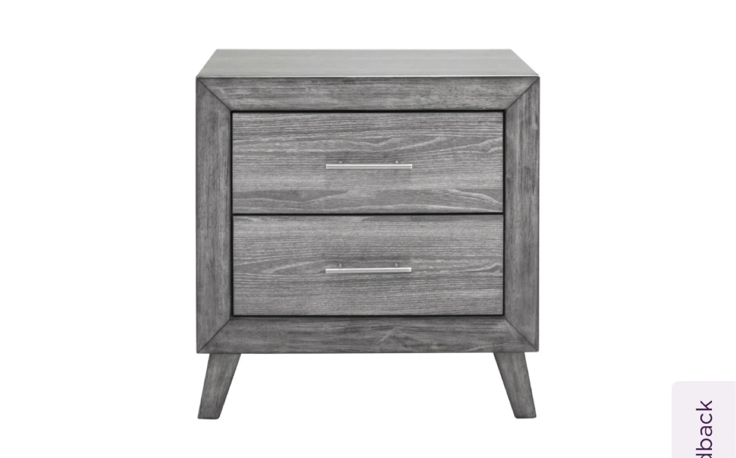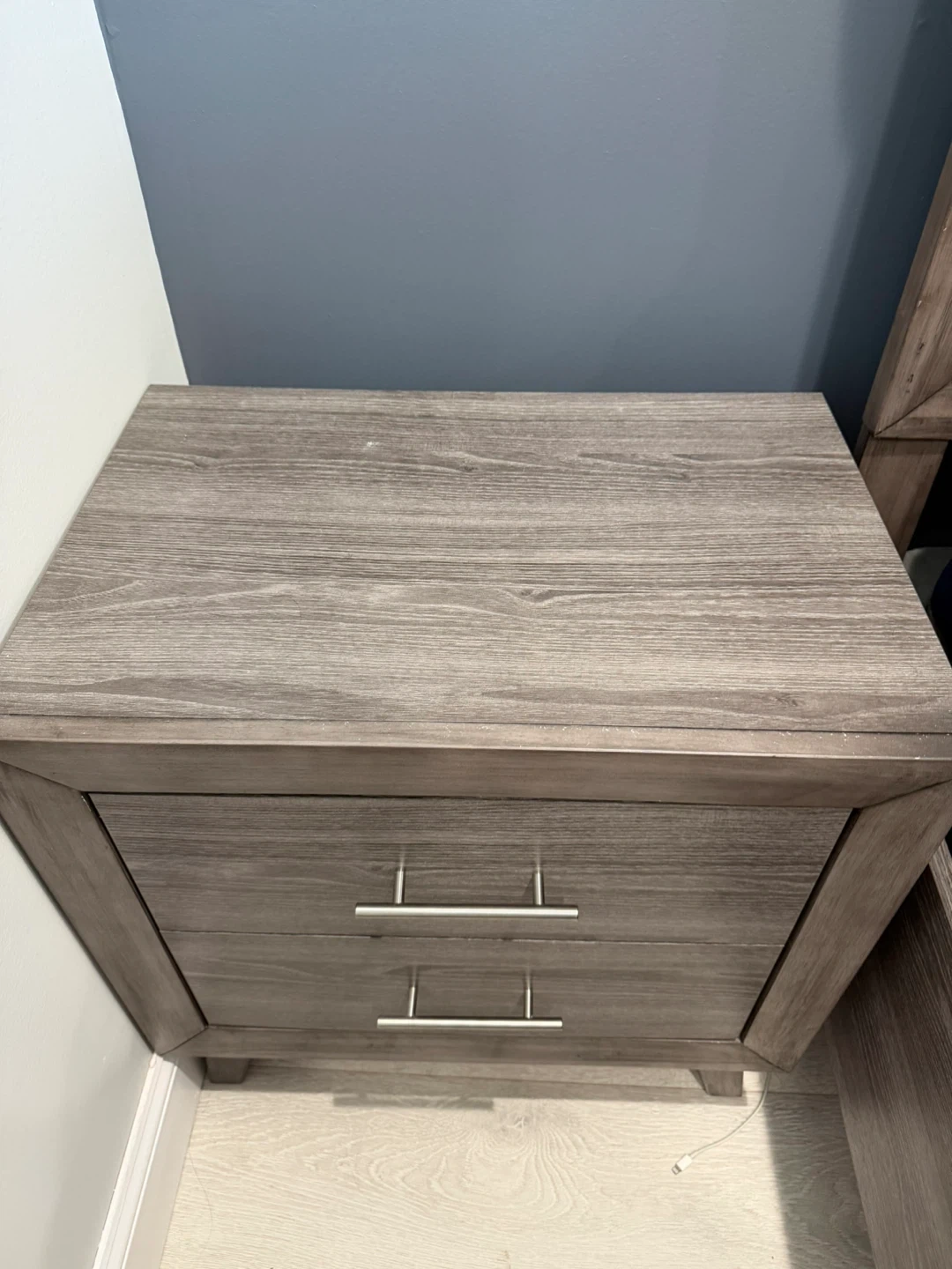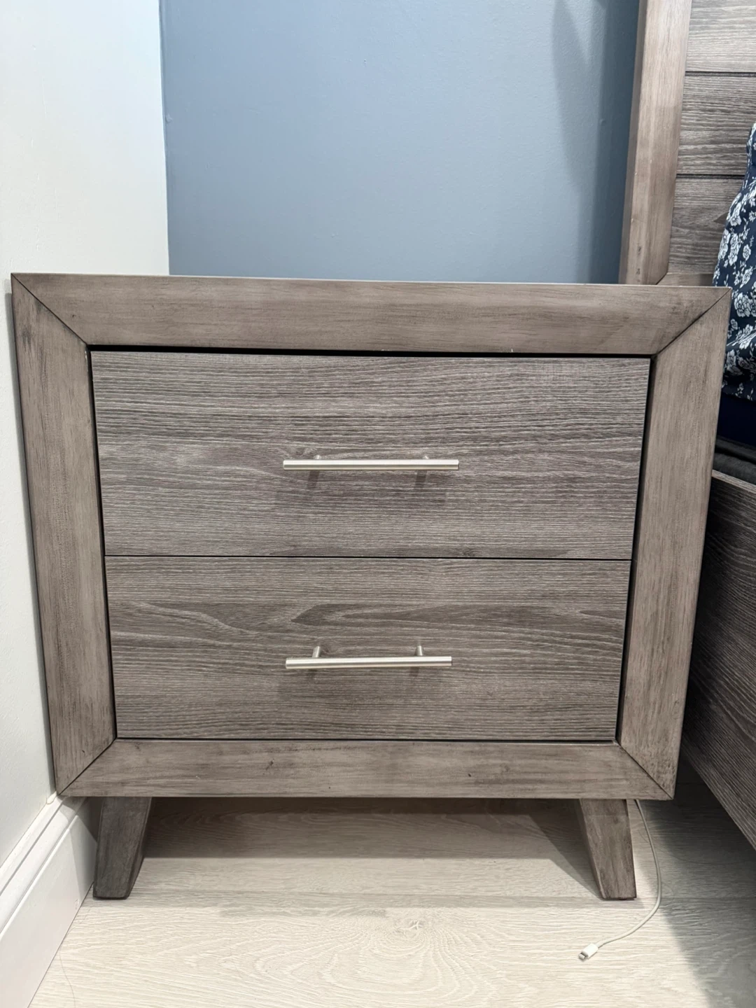 This nightstand has a grey wood finish and two drawers for storage. It's 24.5 inches tall, 17 inches wide, and 23.5 inches long. The nightstand weighs 51 lbs. I have two nightstands, let me know if interested I will give you a deal.