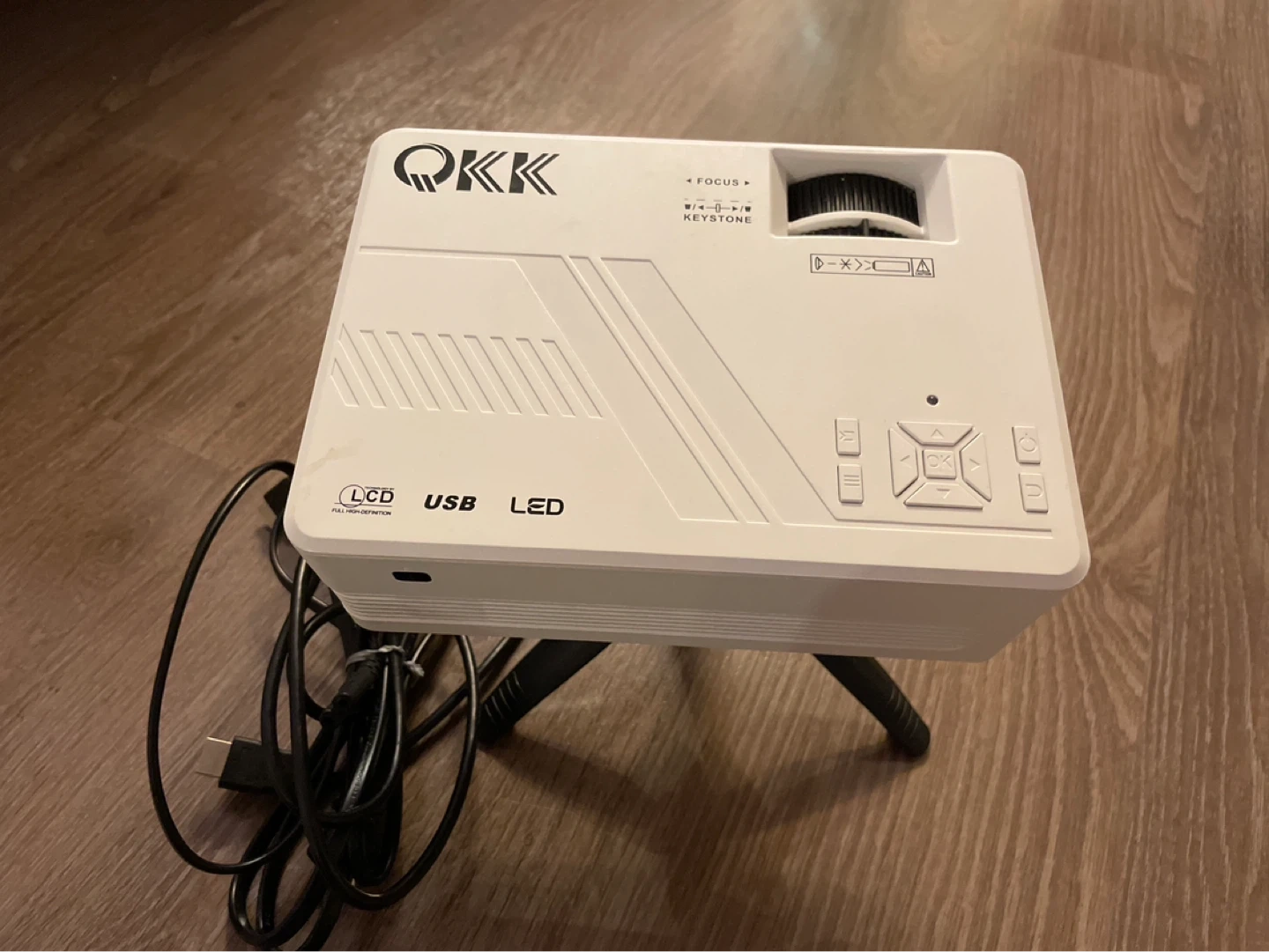 White KK brand portable projector. Supports LCD, USB, and LED inputs. Includes a small tripod for placement. Perfect for setting up a movie night anywhere!