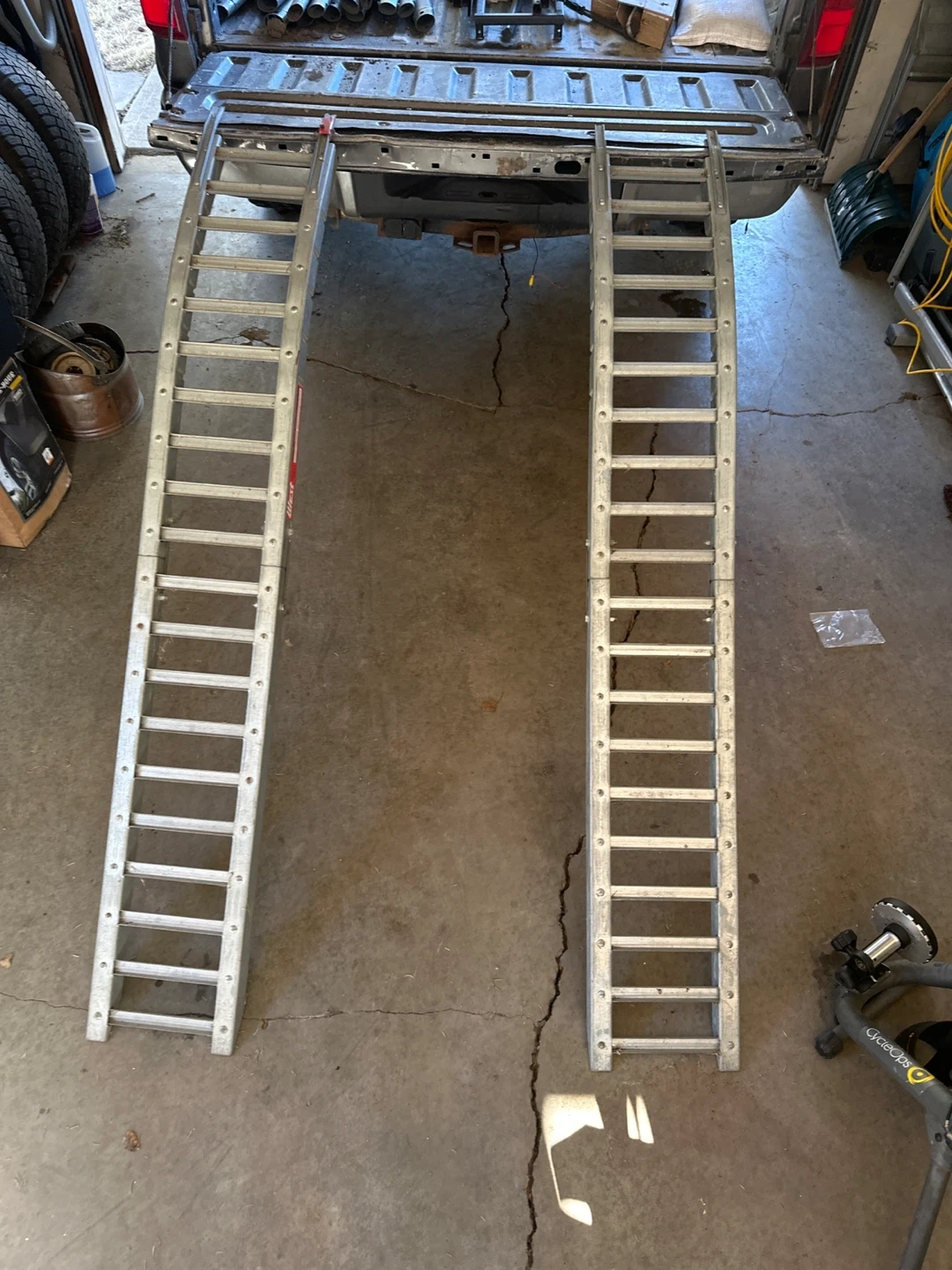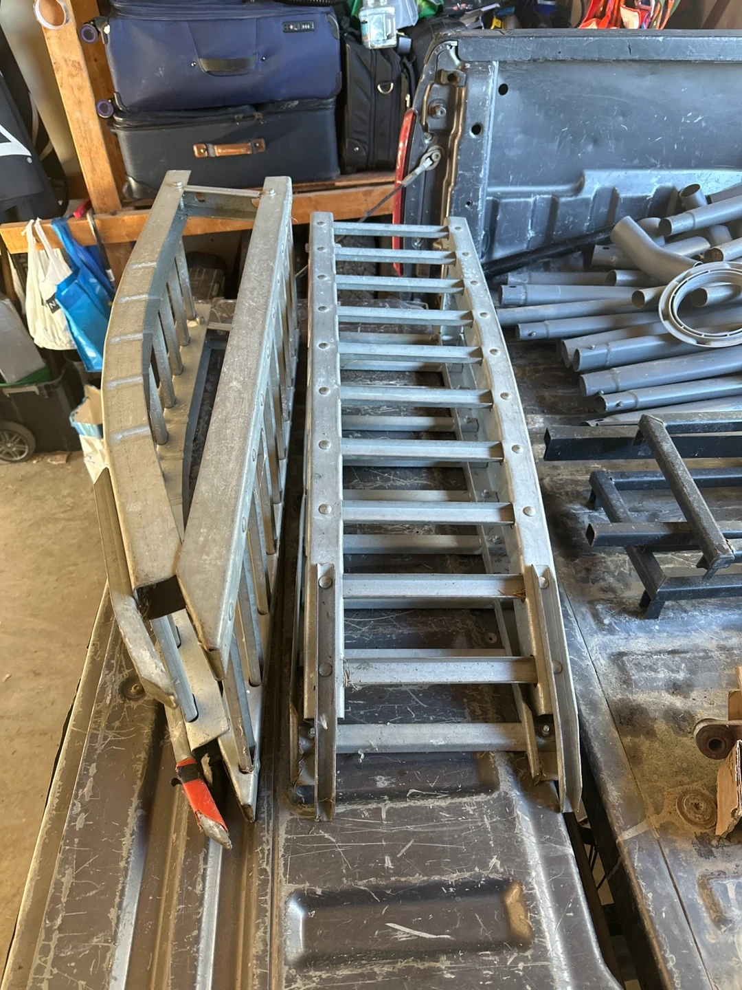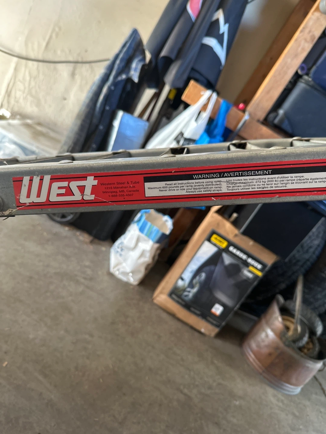 Pair of West Steel & Tube loading ramps. These ramps are made of steel and are ready for use. They're great for loading ATVs, motorcycles, or other equipment into a truck or trailer.