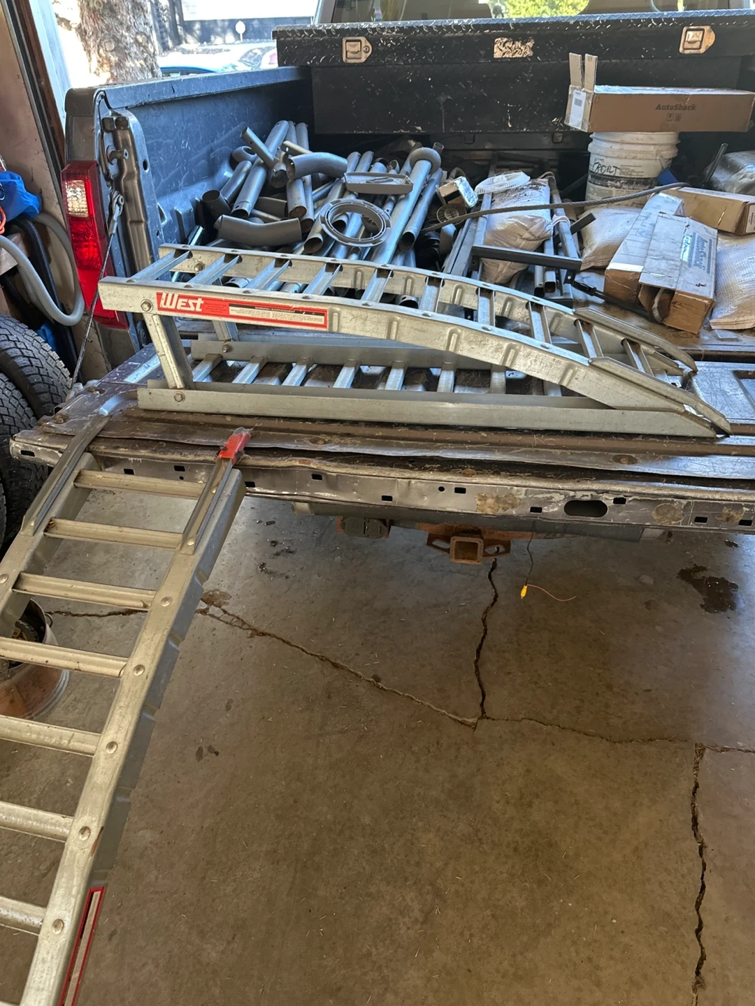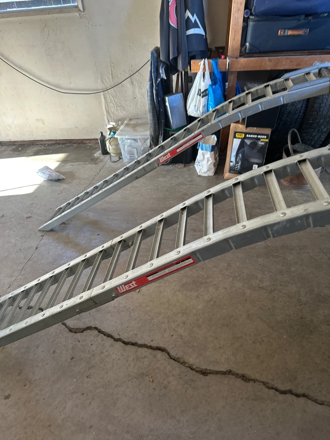 Pair of West Steel & Tube loading ramps. These ramps are made of steel and are ready for use. They're great for loading ATVs, motorcycles, or other equipment into a truck or trailer.