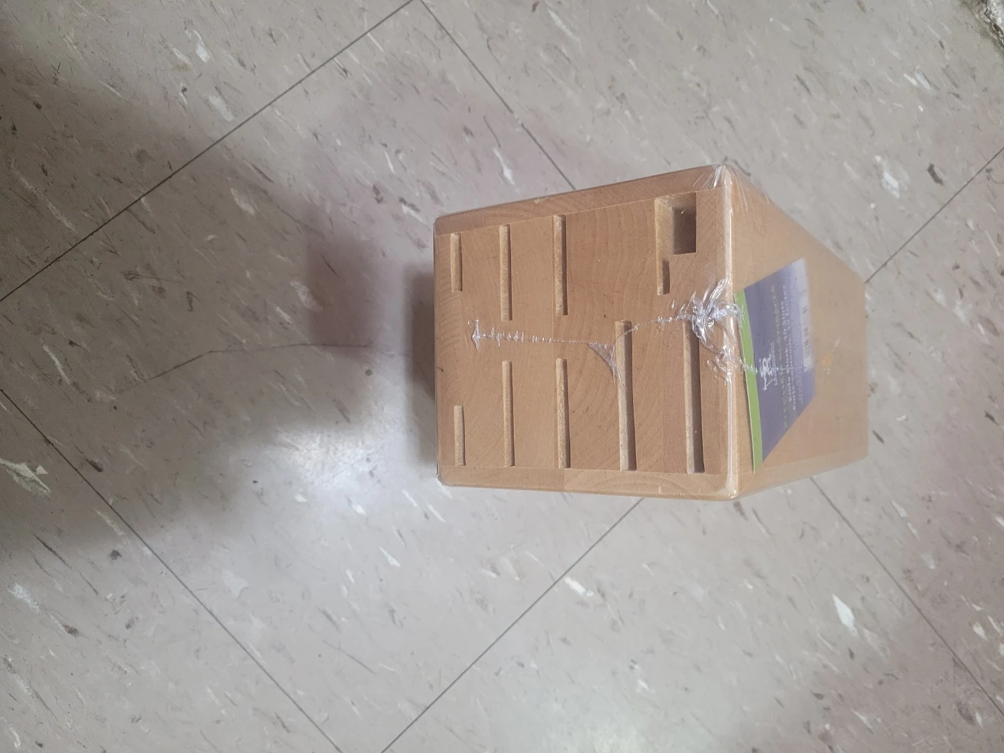 This is a wooden knife block with 10 slots. It's designed to keep your kitchen knives organized and accessible. The block is made of natural wood.