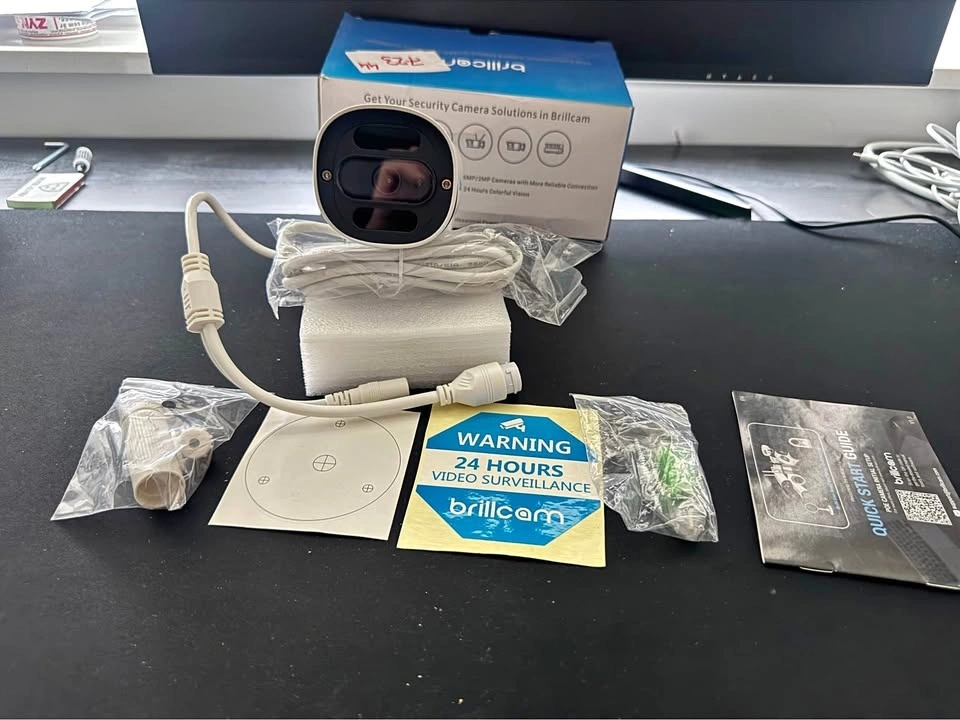 This is a new Brillcam security camera, still in its original box. It comes with the camera, cables, mounting hardware, warning sticker, and quick start guide.
