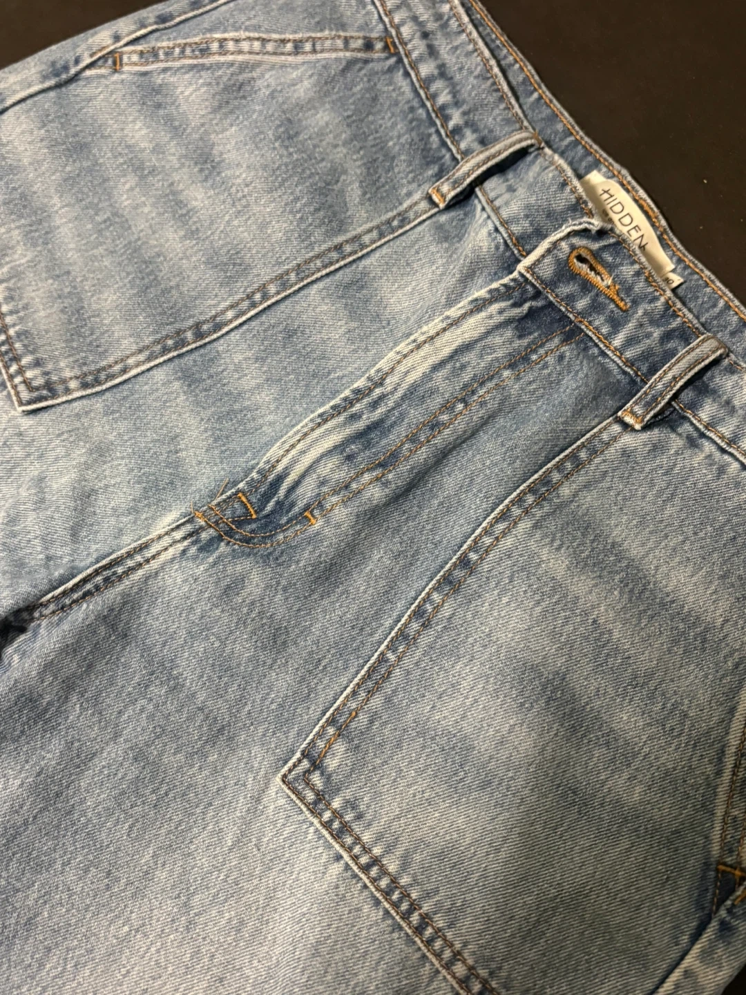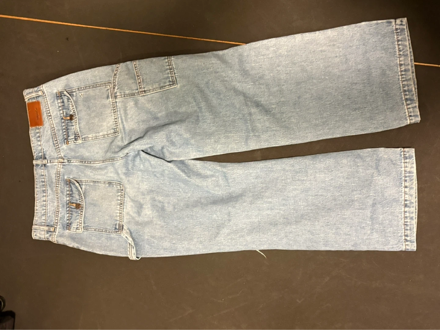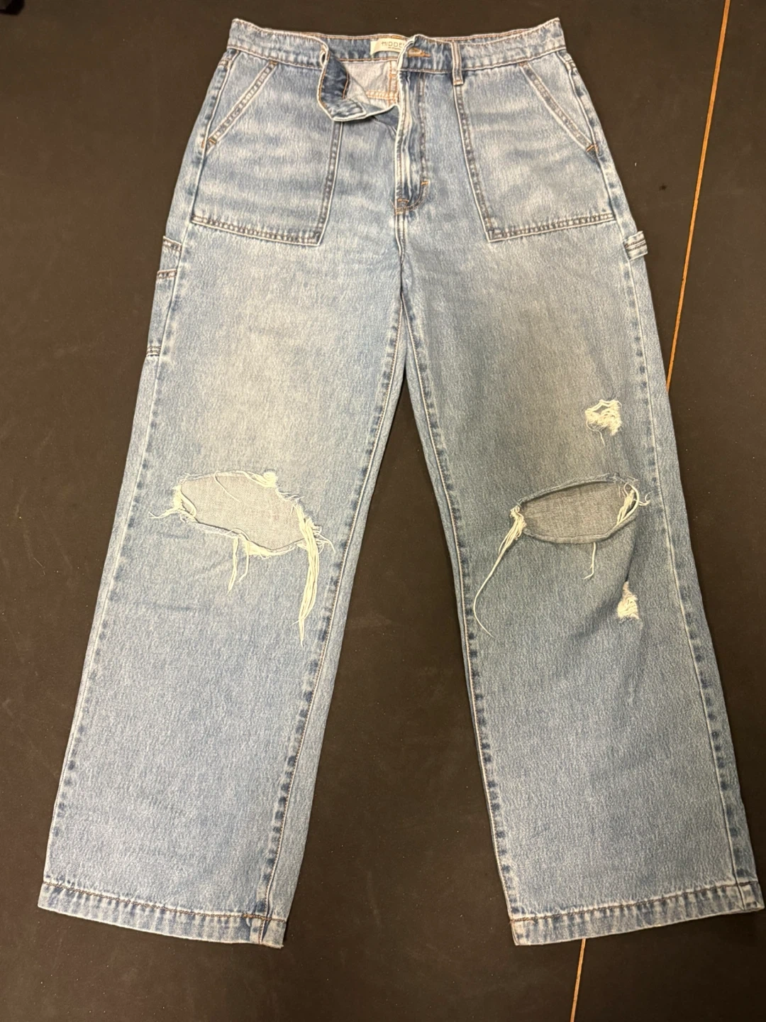 Light wash wide leg jeans by HIDDEN. Made with 100% cotton. These jeans are a size 30 and feature distressed knee details. Perfect for casual wear!