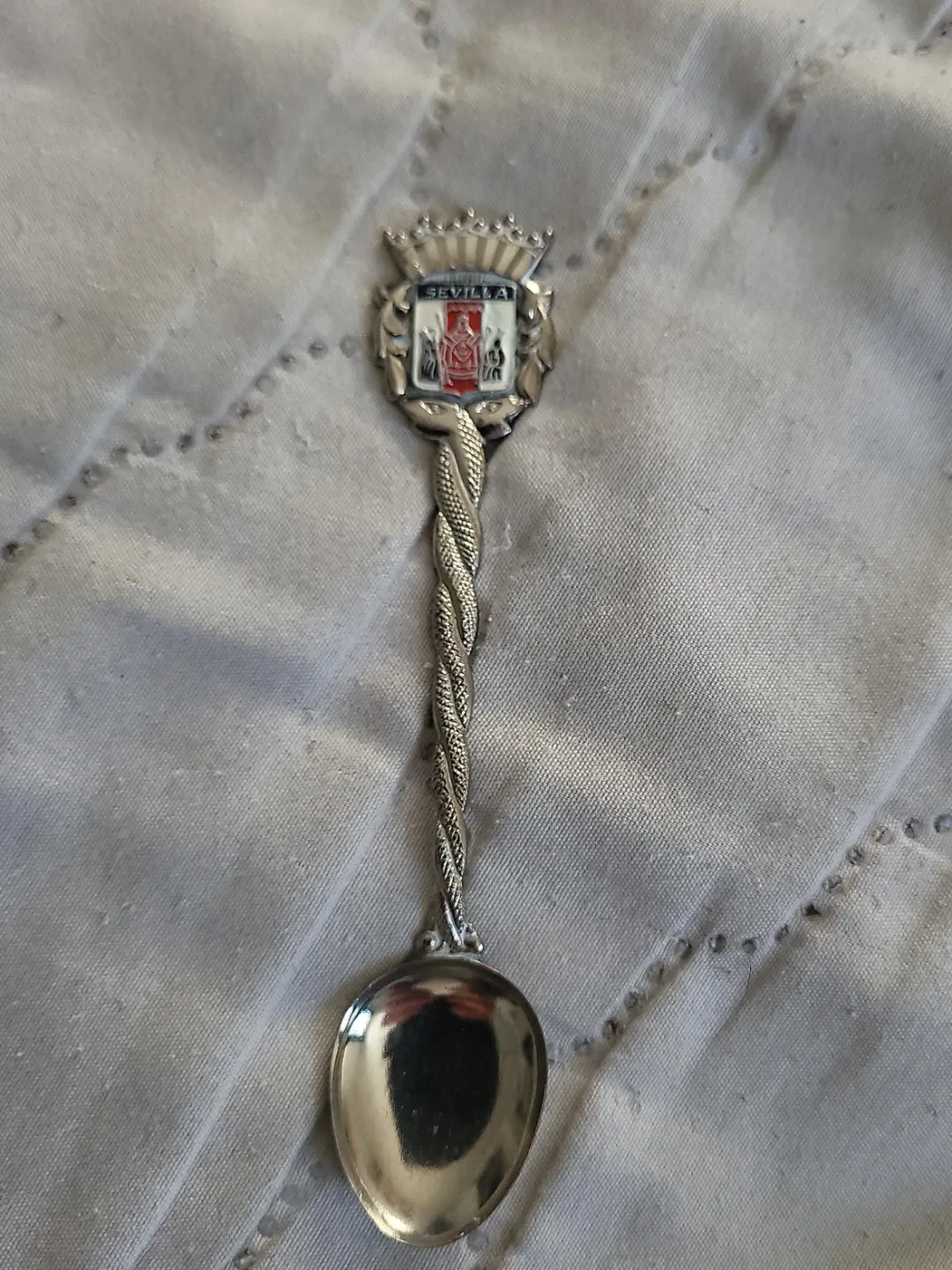 This is a decorative spoon from Sevilla. It features a twisted handle and a detailed crest at the top. It's made of metal and would make a nice souvenir.