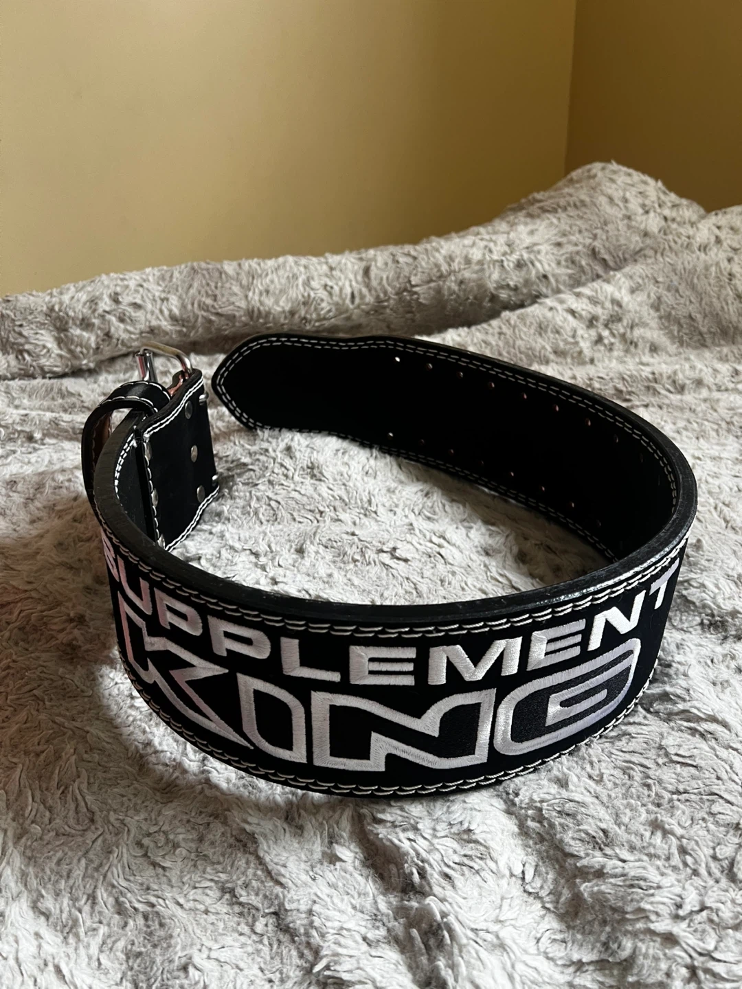 Black weightlifting belt with white embroidered "Supplement King" logo. It features a metal buckle for adjustable closure. Comes with multiple grommets for a secure fit.