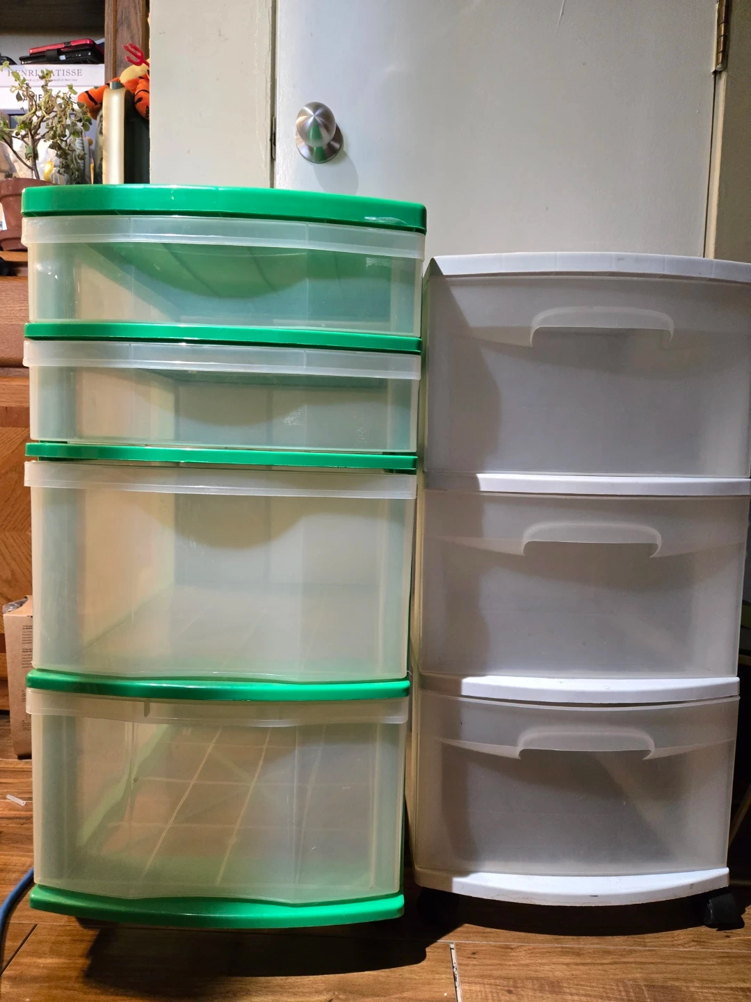 This is a set of four clear plastic storage drawers with bright green trim. Two sets are pictured, with one set having four drawers and the other having three.